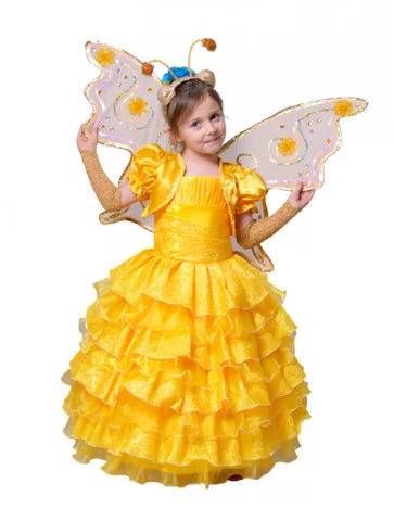 Яскравий, казковий образ, що ніби створений із промінців сонця та літнього настрою — легкий, повітряний і надзвичайно святковий. Цей чарівний костюм наповнює образ теплом і радістю, перетворюючи дитину на справжнього метелика з казкового саду. Пишна жовта сукня з багатоярусними рюшами красиво рухається під час танцю та гри, а прозорі крильця з декоративними візерунками додають магії кожному кроку. Ідеальний варіант для оренди карнавальних костюмів на ранки, вистави, фотосесії та тематичні свята, коли хочеться створити світлий і незабутній образ.