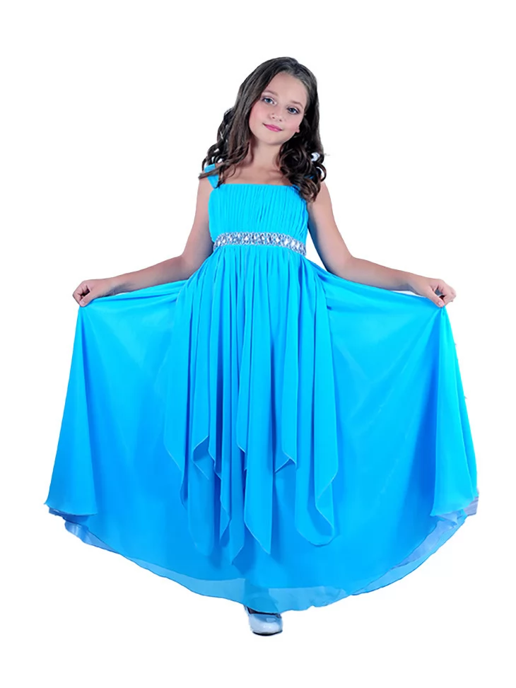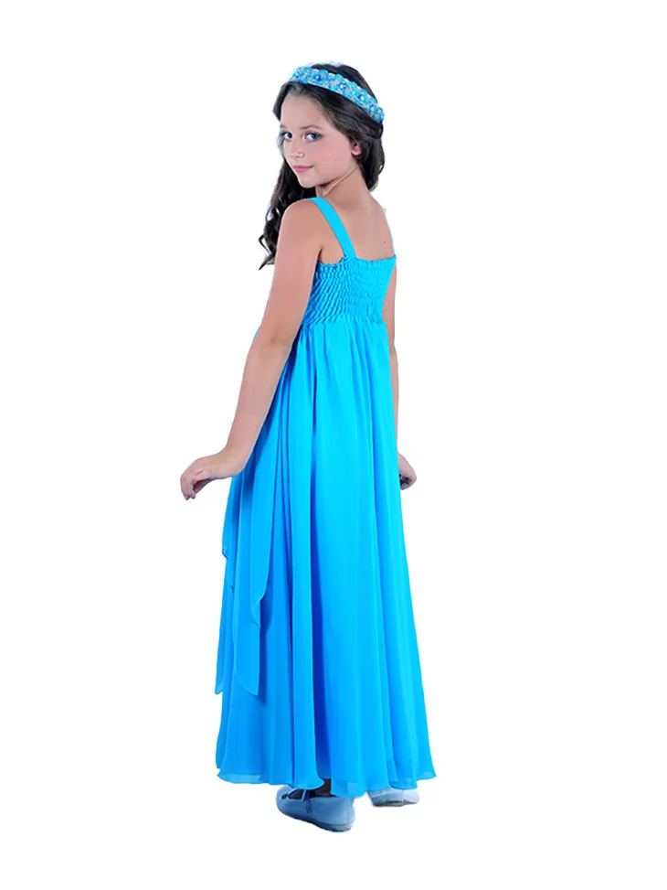 Легка, повітряна та елегантна сукня у насиченому блакитному відтінку створює образ справжньої юної принцеси або богині свята. М’яка струмлива тканина красиво драпірується в русі, а декоративний сріблястий пояс підкреслює талію та додає святкового блиску. Ідеальний варіант для оренди карнавальних костюмів на випускні, фотосесії, тематичні події та урочисті святкування, коли хочеться ніжності й витонченості в кожній деталі.