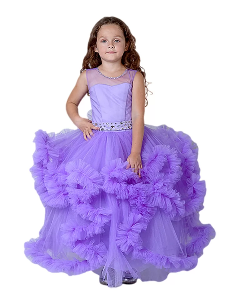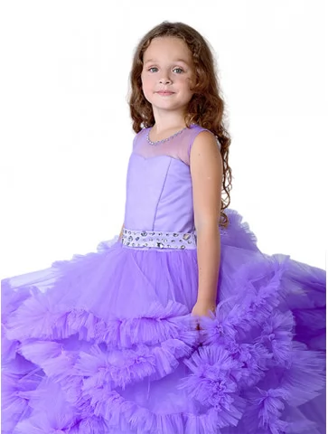Ніжна та повітряна сукня, що виглядає мов казкова хмаринка — легка, об’ємна та по-справжньому святкова. Цей образ ідеально підходить для оренди карнавальних костюмів на урочистості, фотосесії та дитячі свята. Верх сукні виконаний у м’якому лавандовому відтінку з напівпрозорою вставкою, а пояс декорований блискучими камінцями. Головний акцент — розкішна фатинова спідниця з багатьма хвилястими ярусами, що створюють ефект невагомості й об’єму. Для свят, де хочеться справжньої магії, прокатом карнавальних костюмів ця сукня користується особливою популярністю.