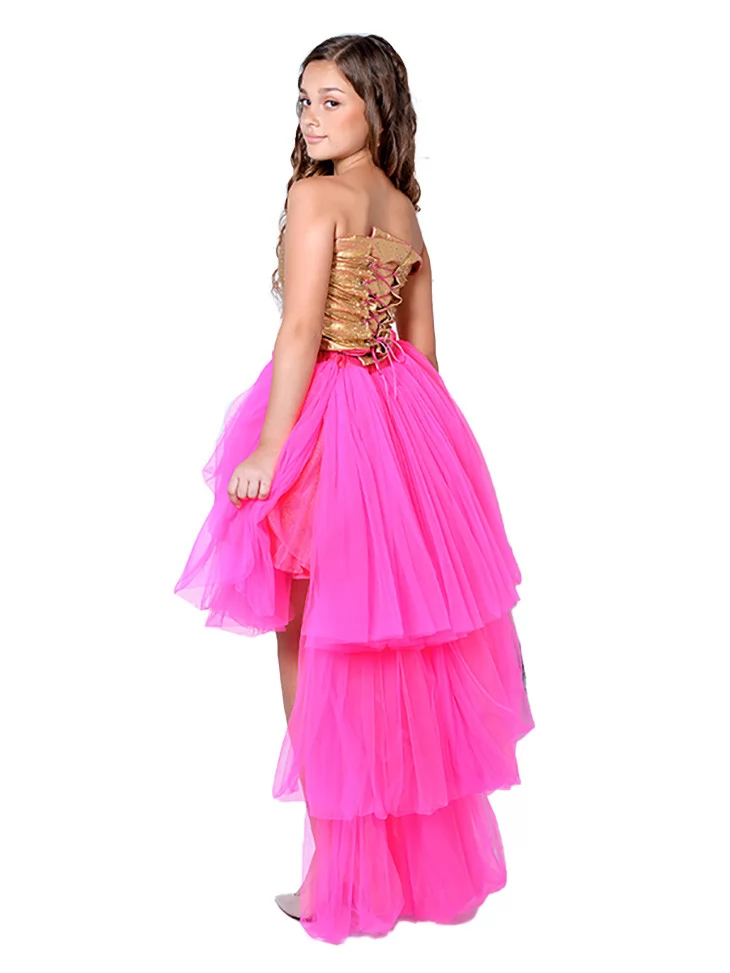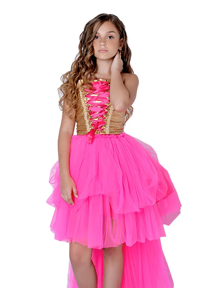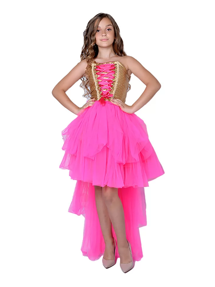 Ефектний та модний образ у стилі Барбі, що поєднує яскраві кольори, святковий блиск і сучасний fashion-настрій. Поєднання золотистого корсетного верху зі шнурівкою та пишної рожевої спідниці створює стильний силует, який виглядає дуже яскраво й святково. Такий образ чудово підходить для оренди карнавальних костюмів на вечірки, виступи та фотосесії.