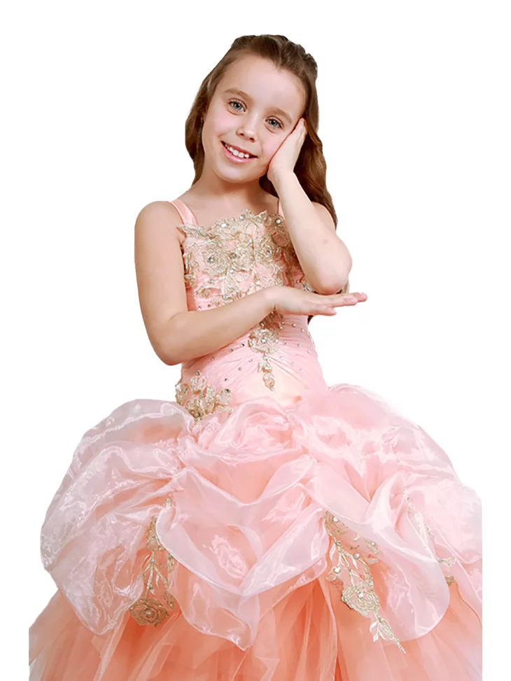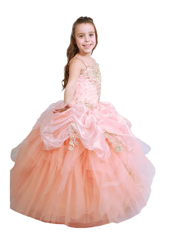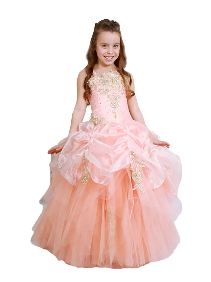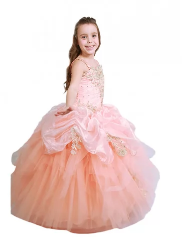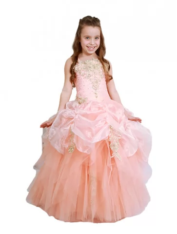 Сукня бальна Персикова Хмара з золотим декором наповнює образ ніжністю, святковим блиском і стане чудовим вибором для прокату карнавальних костюмів на особливі події.