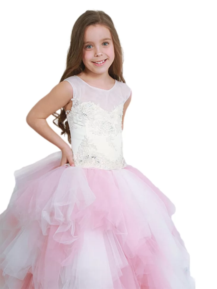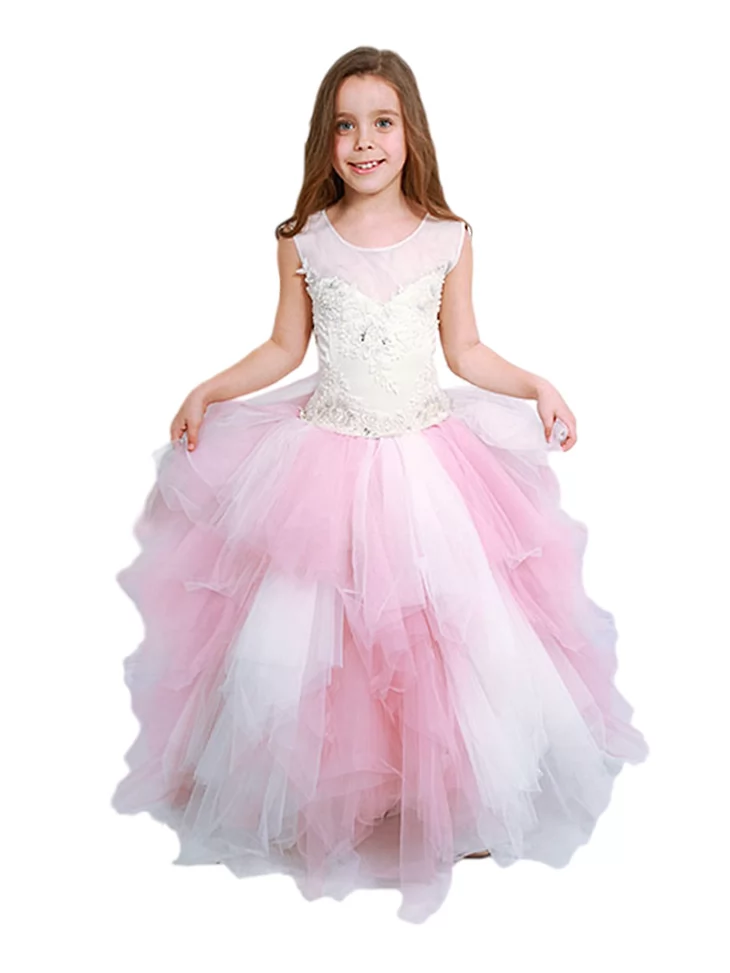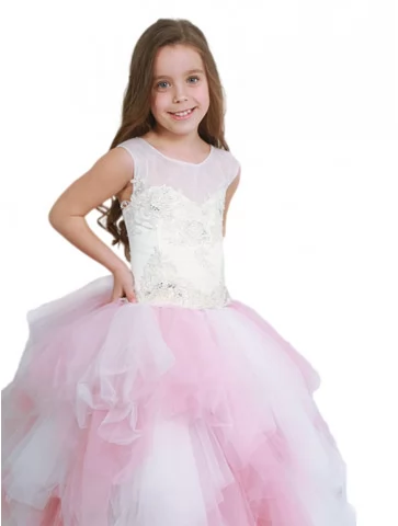 Ніжний, повітряний образ маленької принцеси, що поєднує світлу елегантність і казкову легкість. Молочний корсет із витонченим мереживним декором красиво контрастує з пишною багатошаровою спідницею у рожевих відтінках, створюючи ефект справжньої бальної сукні. Образ виглядає урочисто, легко й дуже фотогенічно — ідеальний вибір для оренди карнавальних костюмів на ранки, бали, фотосесії та святкові події.