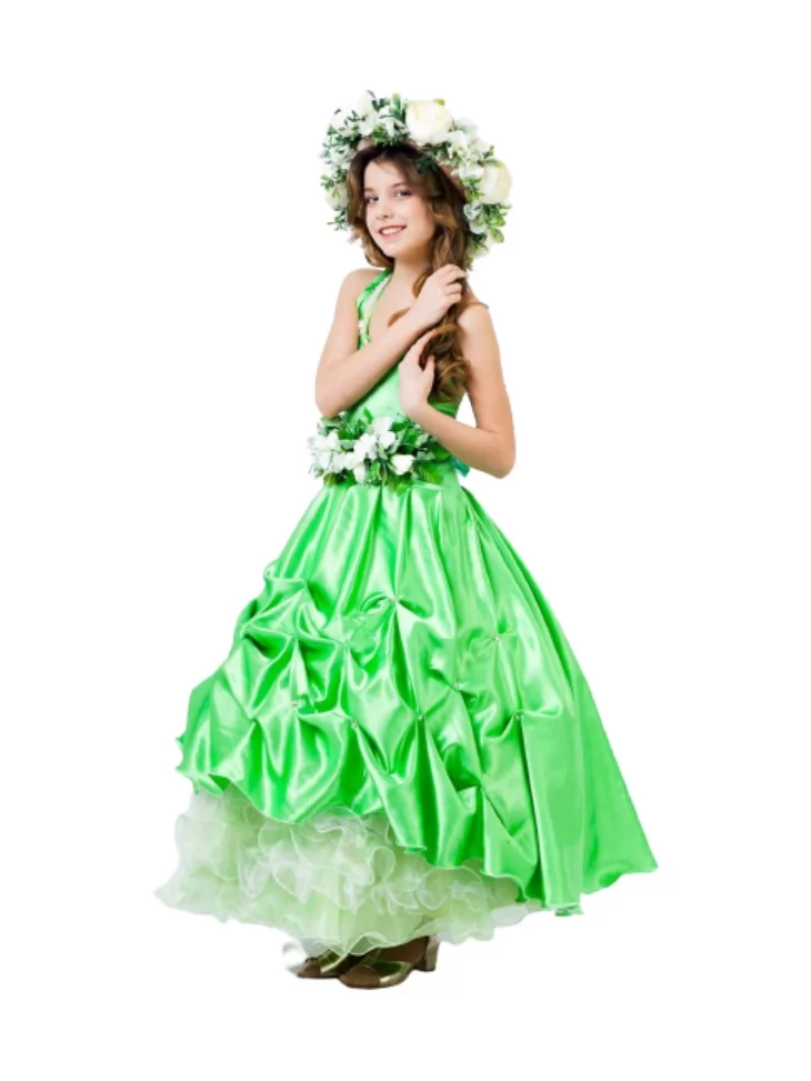 Яскравий весняний образ, сповнений свіжості, зеленого сяйва та відчуття справжнього розквіту природи. Цей розкішний костюм поєднує соковитий смарагдовий відтінок атласної спідниці з квітковим декором на талії та вінком із білих весняних квітів, що створюють образ живої, квітучої весни. Легкі драпірування тканини красиво рухаються під час ходи й надають сукні святкової пишності. Чудовий варіант для оренди карнавальних костюмівна весняні свята, виступи та фотосесії.