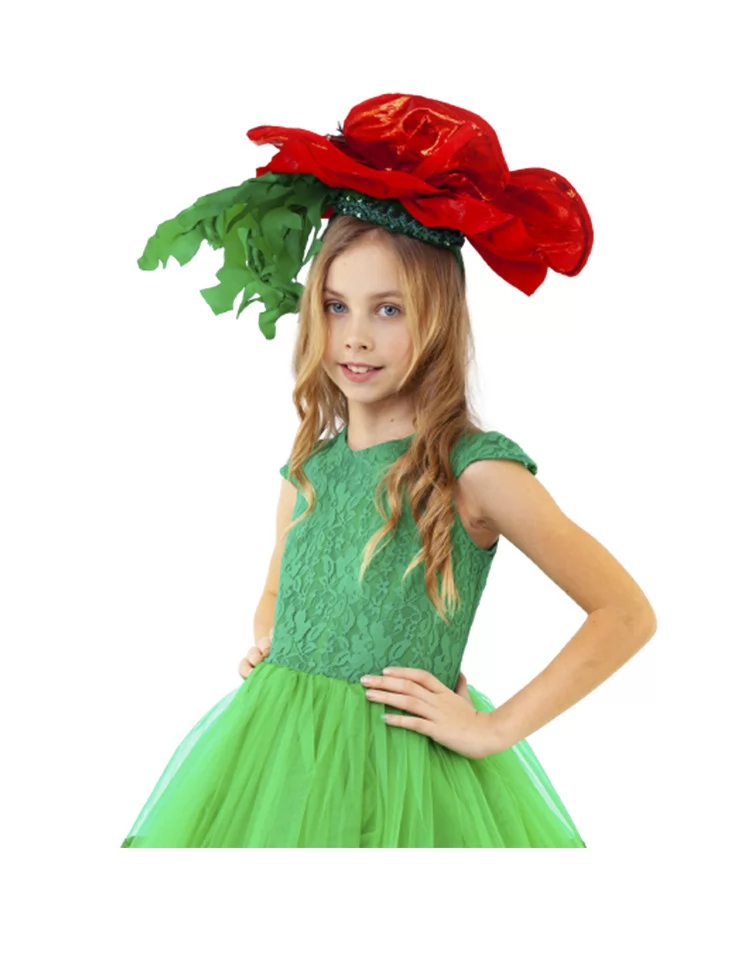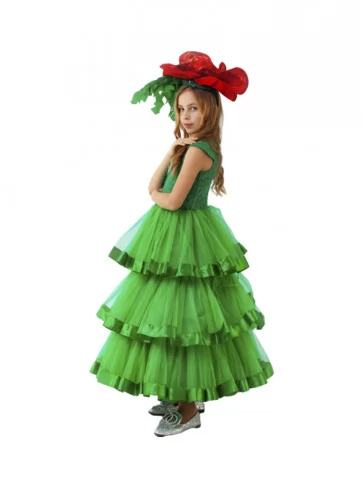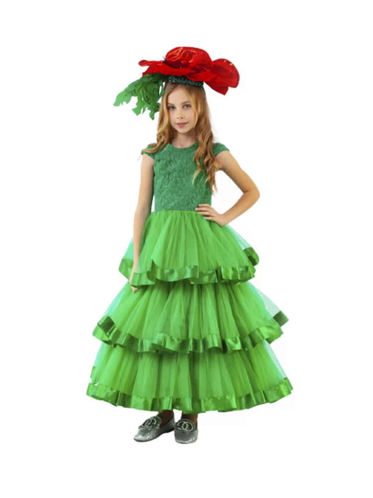 Ефектний квітковий образ, що поєднує соковиту зелень стебла й величну красу розквітлого мака у святковому силуеті. Багатоярусна сукня насиченого зеленого кольору з мереживним верхом і пишною фатіновою спідницею створює відчуття живої рослини у повному розквіті. Об’ємна червона квітка мака з декоративним листям на голові робить образ яскравим акцентом сцени та фотозони. Це чудовий вибір для оренди карнавальних костюмів на святкові події, концерти й тематичні вистави.