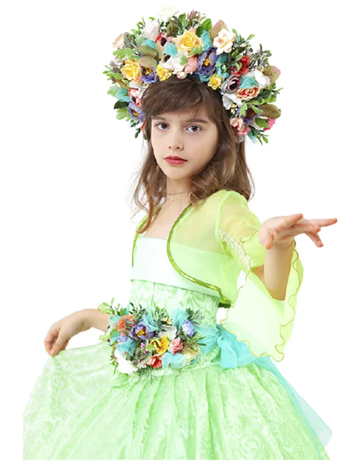 Ніжний весняний образ, що поєднує свіжість зелені, яскраві квіти та легкість казкового настрою. Цей витончений костюм створює образ справжньої володарки весни — легкої, квітучої та сяючої. Повітряна сукня ніжно-зеленого відтінку гармонійно поєднується з яскравими квітковими акцентами на талії та розкішним вінком, що додає святковості кожному руху. Чудовий вибір для оренди карнавальних костюмів на ранки, фотосесії та виступи.