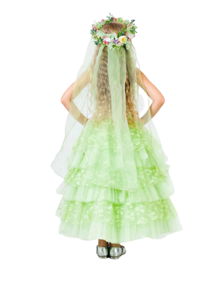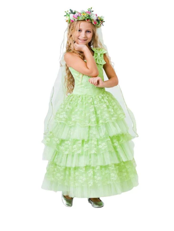 Повітряний, світлий і по-справжньому казковий образ, що передає ніжність першої зелені та чарівність квітучої природи. Багатоярусна сукня у свіжому салатовому відтінку створює розкішний об’ємний силует, а мереживні вставки та легка прозора накидка додають руху й легкості кожному кроку. Квітковий вінок гармонійно завершує образ справжньої Весни. Ідеальний варіант для оренди карнавальних костюмів на святкові виступи, ранки та фотосесії.