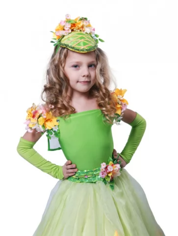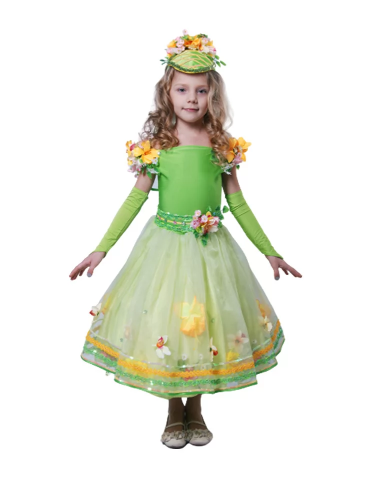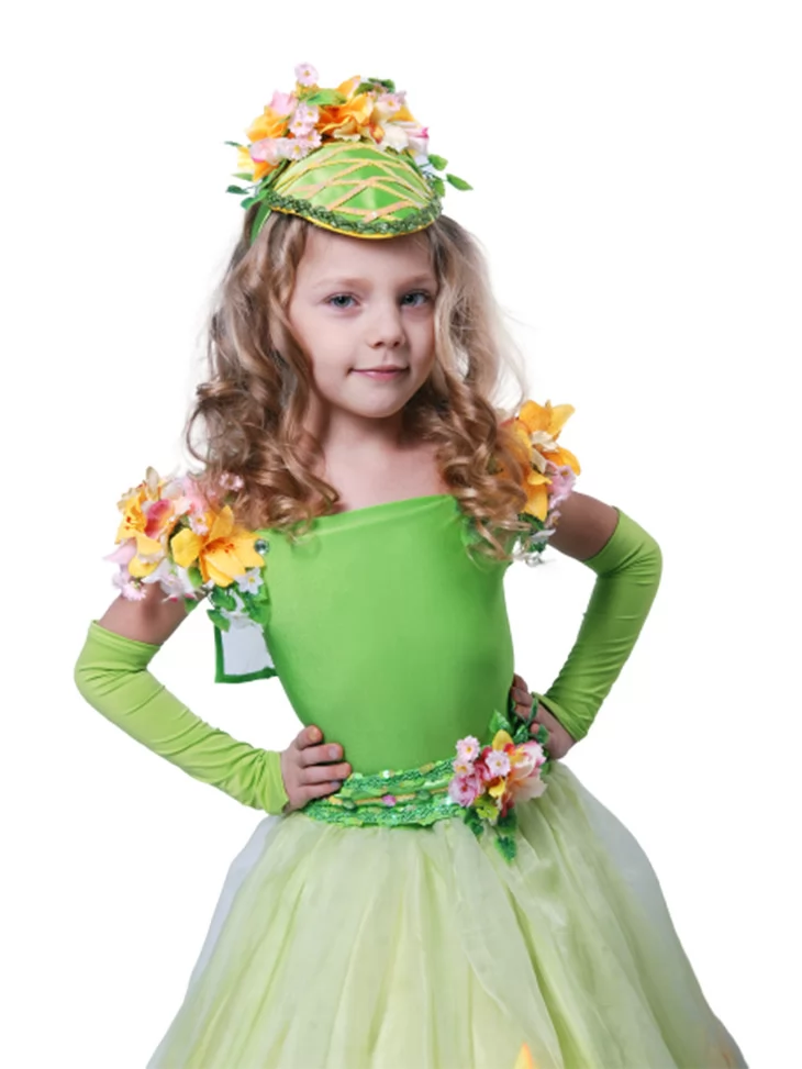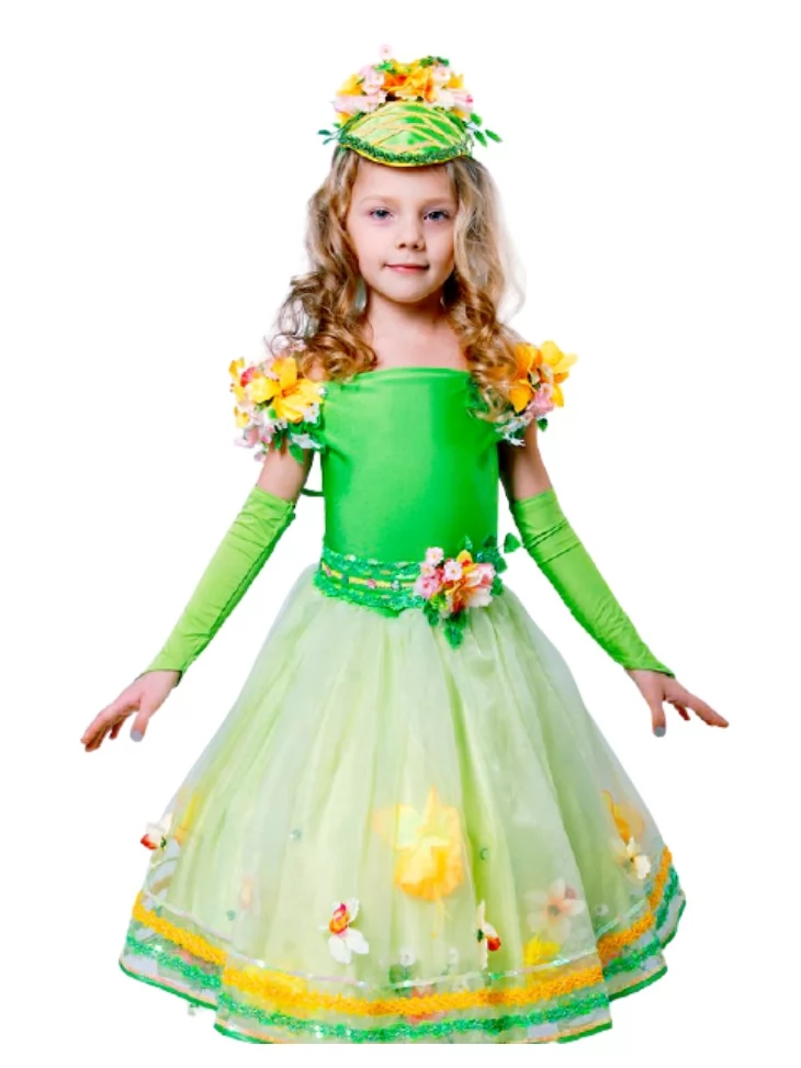 Ніжний казковий образ водяної квітки, що розквітає серед світла, зелені та прозорої роси. Цей витончений костюм поєднує свіжість весняної природи та чарівну легкість водяної лілії. Світло-зелений ліф гармонійно переходить у фатінову спідницю з квітковими аплікаціями, створюючи ефект пелюсток, що колишуться на воді. Квіткові декорації на плечах і головному уборі надають образу об’ємності й святковості. Чудовий варіант для оренди карнавальних костюмів на ранки, вистави та фотосесії у стилі природи.