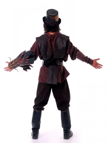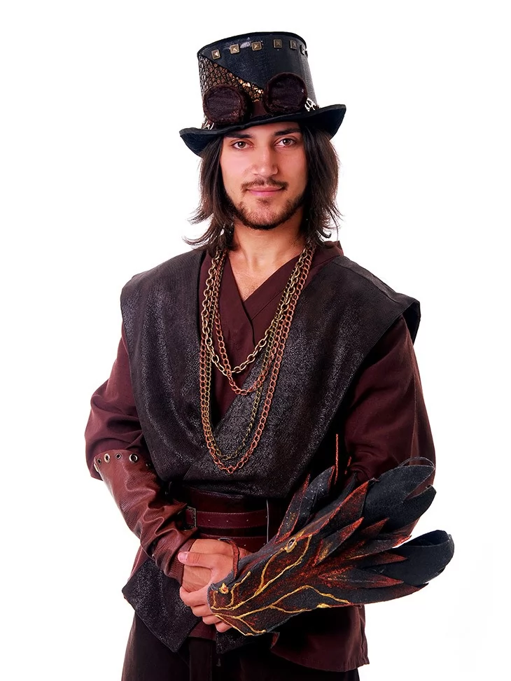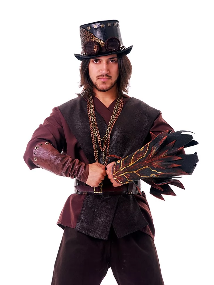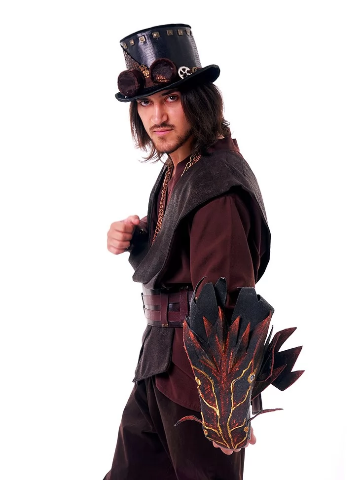 Цей костюм втілює образ могутнього воїна або чарівника з фентезійного світу, де дракони підкоряються не лише магії, а й технічній інженерії. Насичені темно-коричневі відтінки, ланцюги, ремені та вогняна голова дракона на руці — створюють образ харизматичного персонажа з сильним характером.