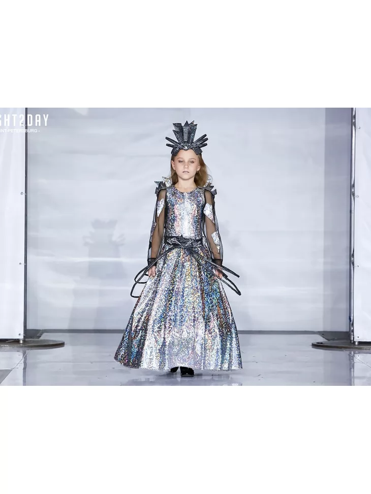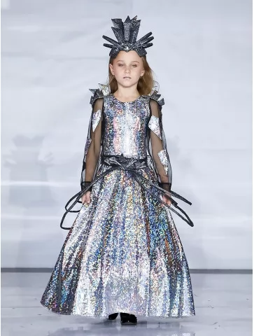 Футуристичний образ із переливами космічного сяйва та подіумною сміливістю. Цей ефектний костюм із колекції Silver Shine зачаровує голографічним блиском, що переливається всіма відтінками срібла. Металізований корсет із блискучим покриттям поєднується з пишною спідницею, яка створює об’єм і сценічність. Прозорі рукави з декоративними елементами додають легкості, а акцентний пояс із об’ємними деталями підкреслює талію. Виразний геометричний головний убір завершує образ космічної королеви. Ідеальний вибір для оренди карнавальних костюмів на виступи, fashion-покази та тематичні свята.