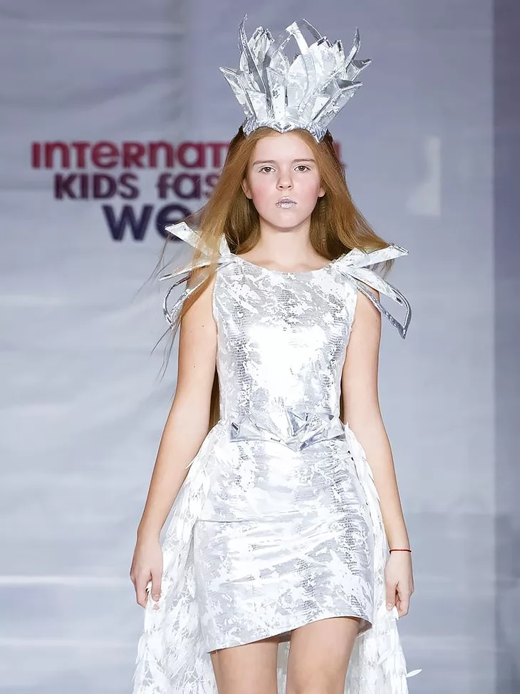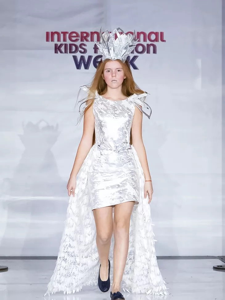 Максимальний блиск, чіткий силует і справжній fashion-настрій у холодному сяйві срібла. Модель із колекції Silver Shine створена для яскравих сценічних виходів. Лаконічна металізована сукня міні поєднується з ефектним паском та довгим фактурним шлейфом, що додає образу драматичності й руху. Високий короноподібний головний убір формує величний силует та підкреслює статусність образу. Ідеальний варіант для оренди карнавальних костюмів на покази, конкурси та новорічні шоу.