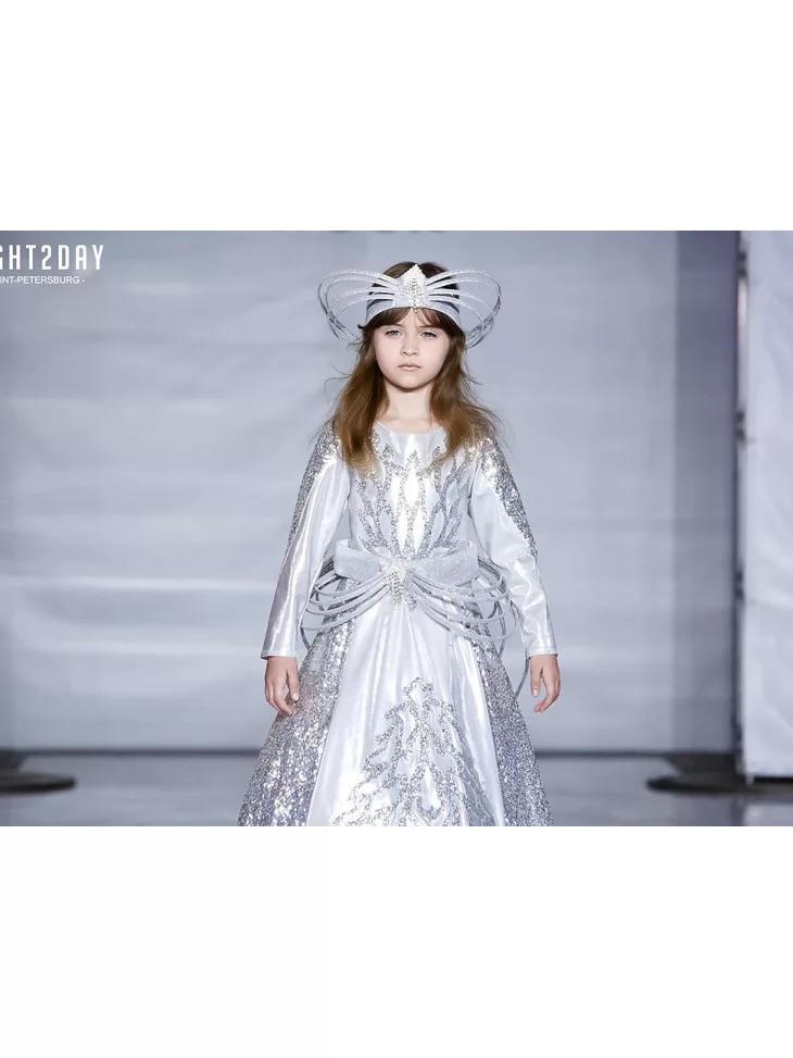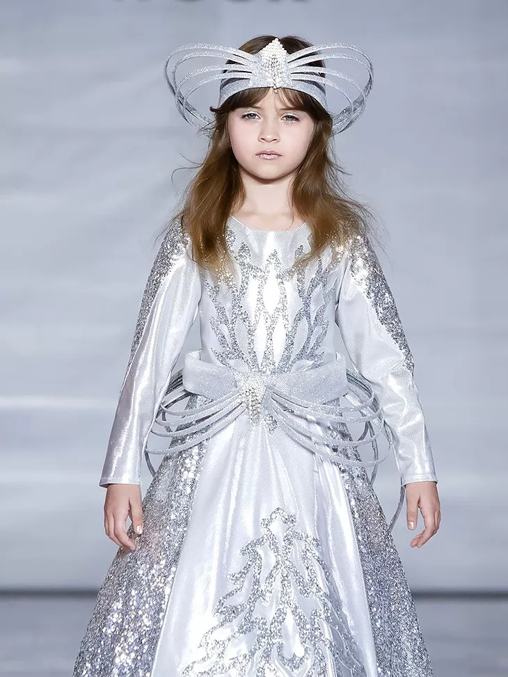 Казковий образ із кришталевим сяйвом та витонченою зимовою магією. Ця розкішна сукня з колекції Silver Shine зачаровує поєднанням гладкого срібного сатину та блискучих паєткових вставок. Вишуканий візерунок на спідниці нагадує морозні візерунки на склі, а декоративний пасок із металевими дугами створює ефект легкого сяйва навколо талії. Незвичайний футуристичний головний убір додає образу подіумної унікальності. Ідеальний варіант для оренди карнавальних костюмів на новорічні свята, виступи та фотосесії.