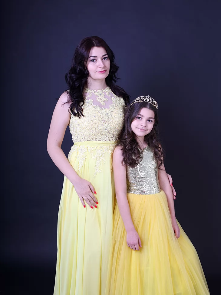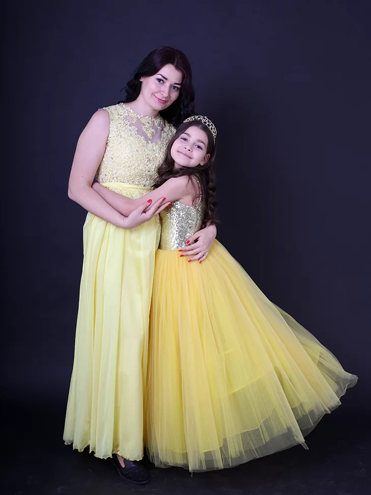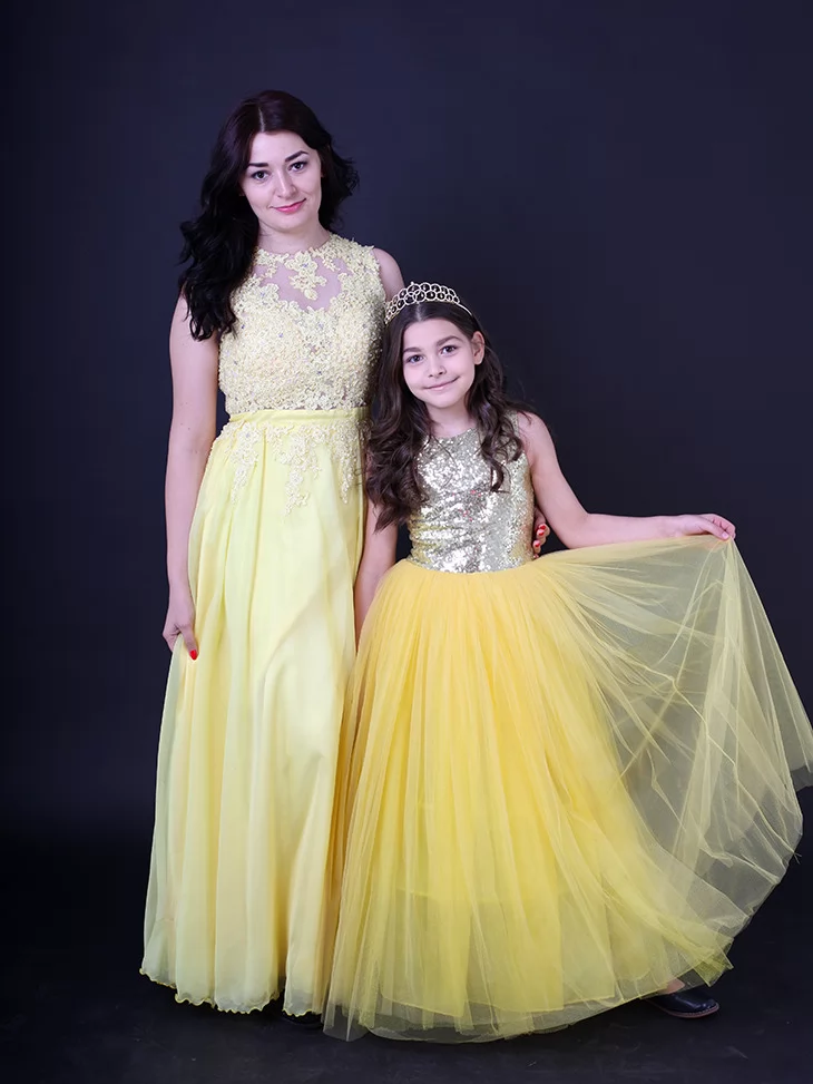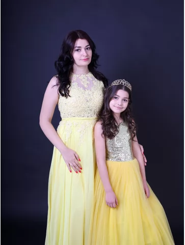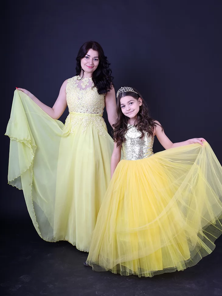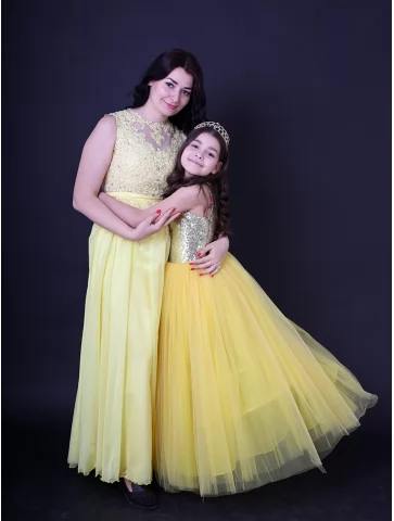 Ніжний, святковий та дуже гармонійний образ для мами і доньки, що випромінює тепло, світло та казкову елегантність. Легкі жовті сукні з мереживними деталями та повітряними фатіновими спідницями створюють справжню атмосферу сонячного свята. Такий парний образ виглядає дуже ефектно на фото і чудово підходить для оренди карнавальних костюмів на урочисті події, фотосесії та тематичні виступи.