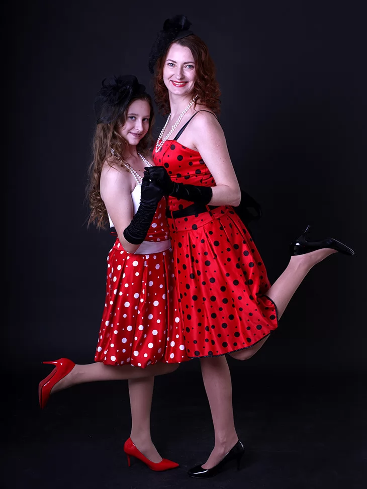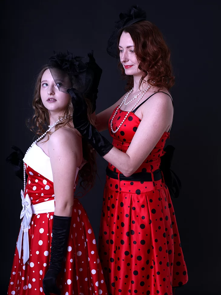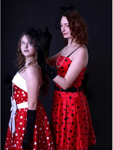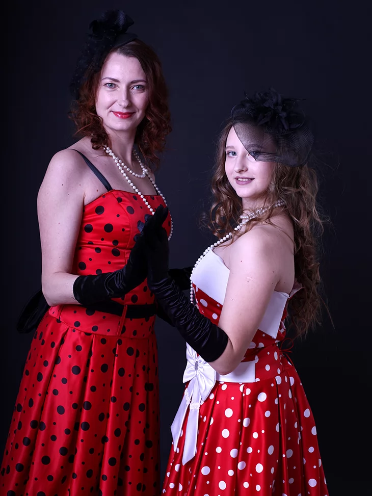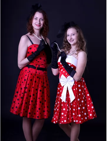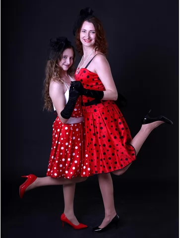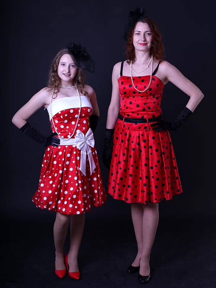 Ці яскраві образи втілюють справжній дух стиляг — свободу самовираження, танці, музику й сміливу моду 50–60-х років. Червоні сукні в горошок із пишними спідницями створюють впізнаваний силует стиляг, який одразу асоціюється з рок-н-ролом, святами та гарним настроєм. Костюми чудово підходять для оренди карнавальних костюмів на тематичні вечірки, виступи та фотосесії.