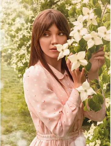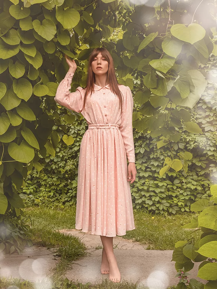 Жіночний образ у стилі нью-лук, де витонченість силуету поєднується з м’якою романтикою та природною елегантністю. Пудрово-рожева сукня з делікатним декором і підкресленою талією створює впізнавану естетику 50-х років, адаптовану до сучасного настрою. Це гарний вибір для оренди карнавальних костюмів, коли хочеться виглядати стильно, ніжно та фотогенічно.