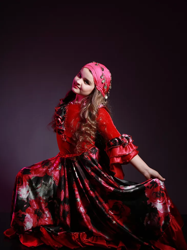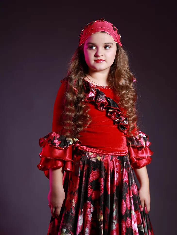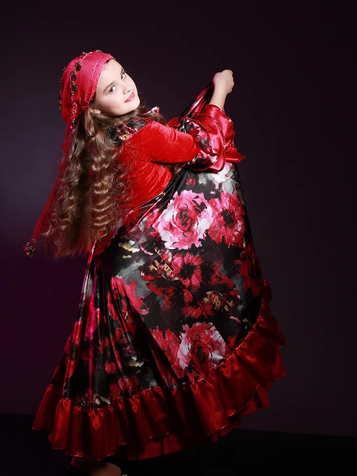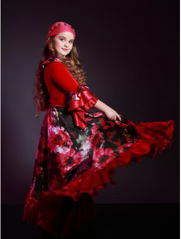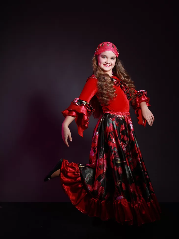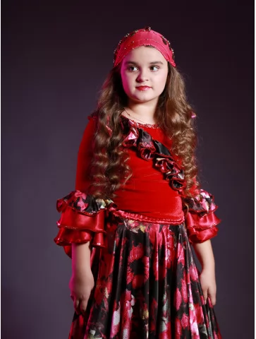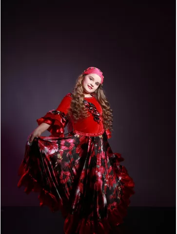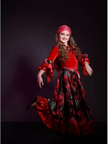Пристрасний, сценічний і дуже емоційний образ, що одразу притягує погляд. Поєднання глибокого червоного кольору з темною квітковою спідницею створює відчуття танцю, свободи та характеру. Це яскравий вибір для оренди карнавальних костюмів на виступи, концерти, тематичні свята та фотосесії.