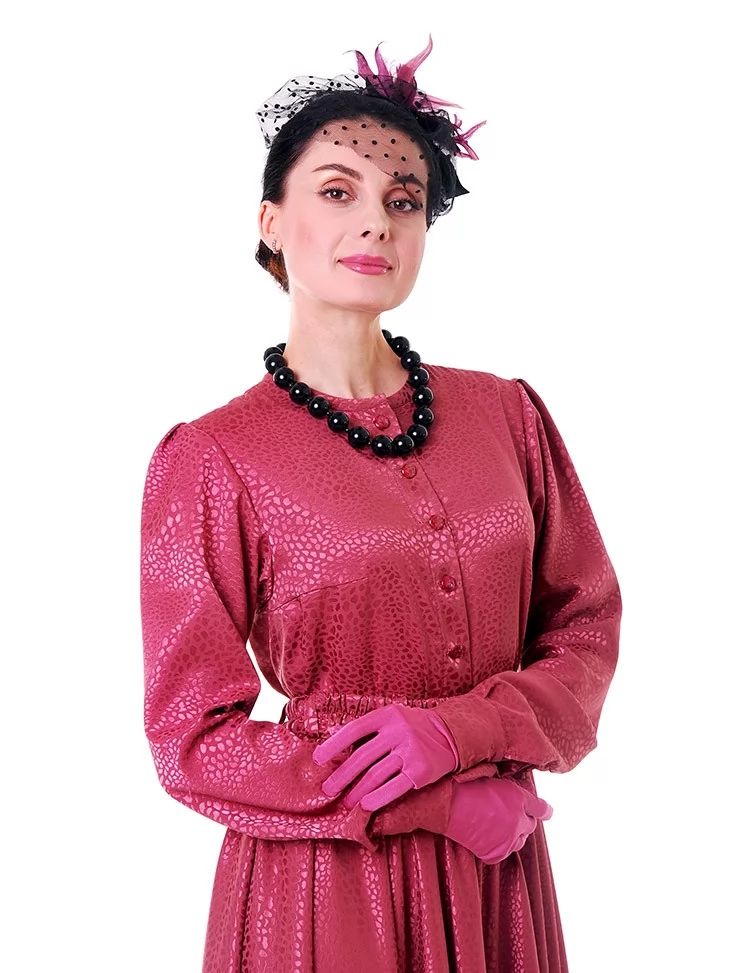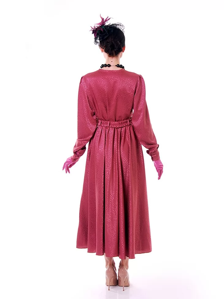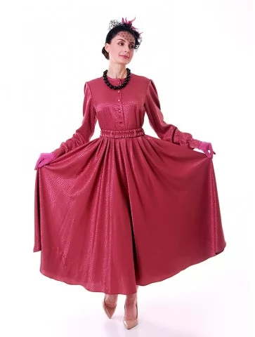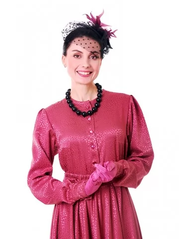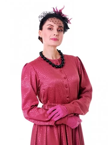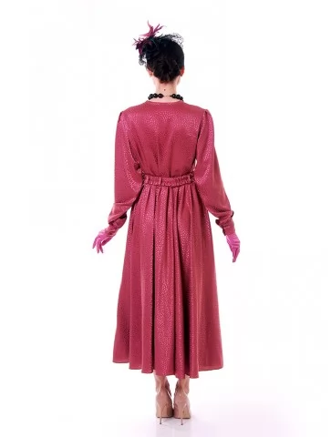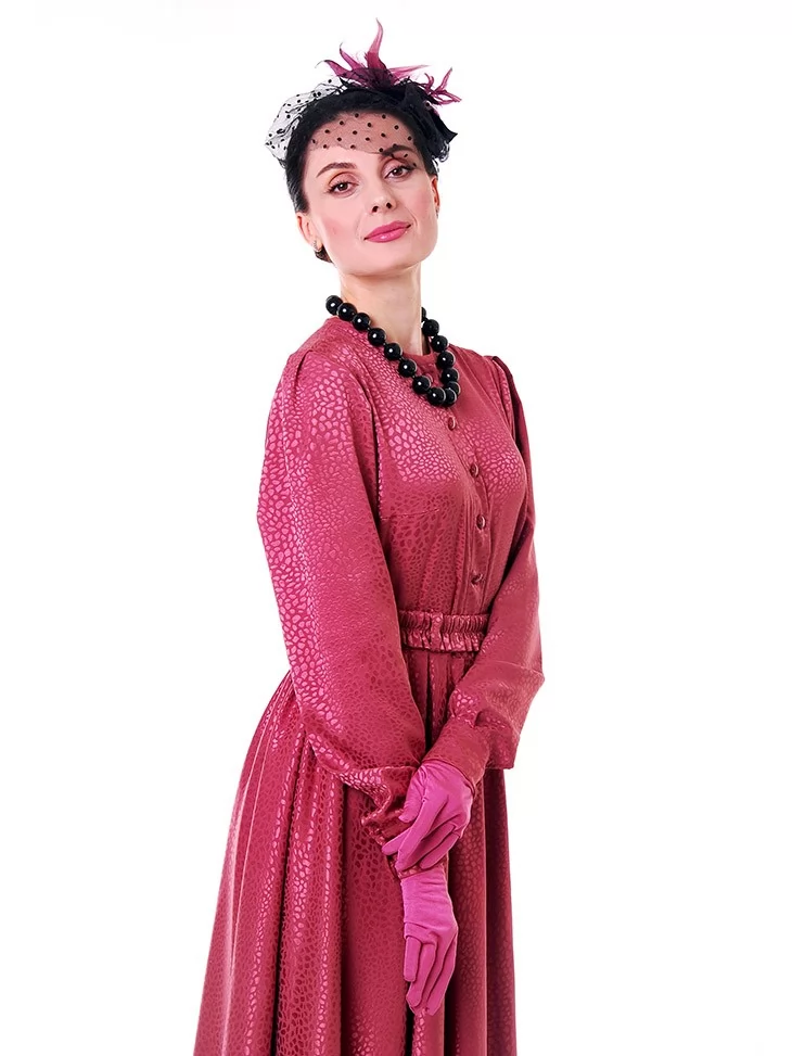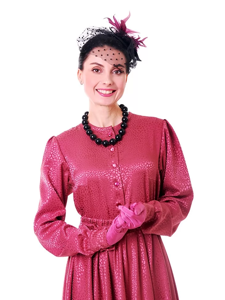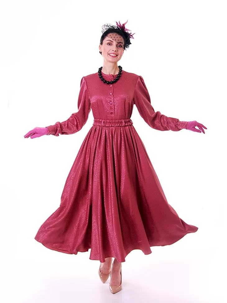 Цей яскравий та водночас елегантний образ у стилі New Look 50-х років створює настрій свята, жіночності й упевненого шарму. Малинова сукня з благородною фактурою красиво підкреслює силует, акцентує талію та розкривається у пишній спідниці, характерній для культової епохи. Капелюшок із вуалеткою, намисто й рукавички завершують образ справжньої світської пані. Це ефектний вибір для оренди карнавальних костюмів на події з ретро-настроєм, фотосесії та виступи.