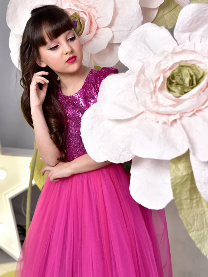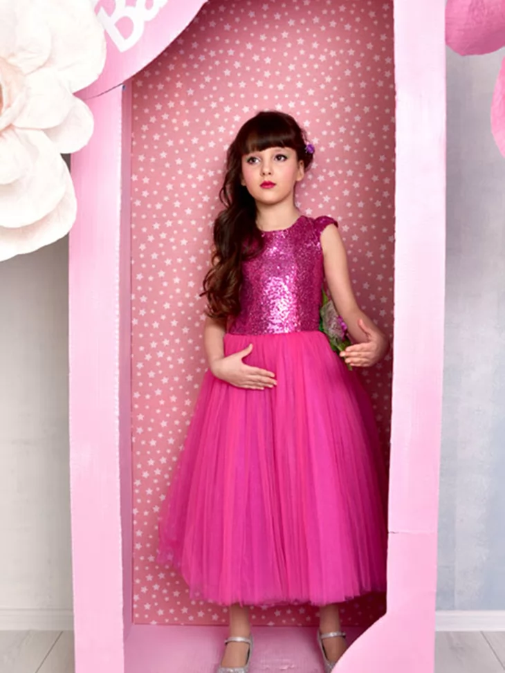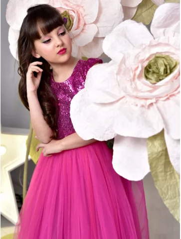– яскрава рожева сукня з блискучим верхом із паєток