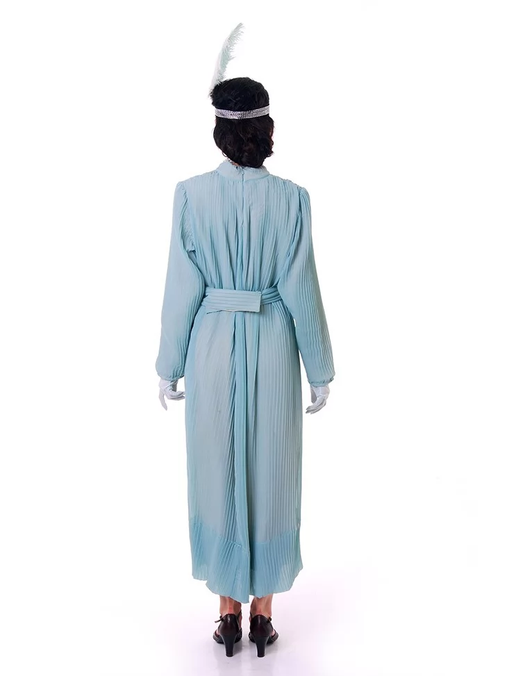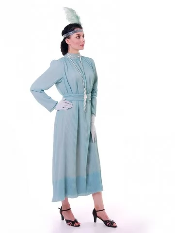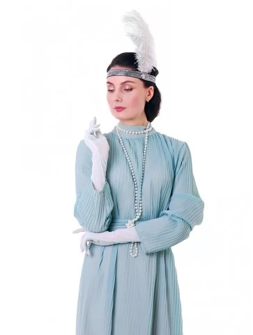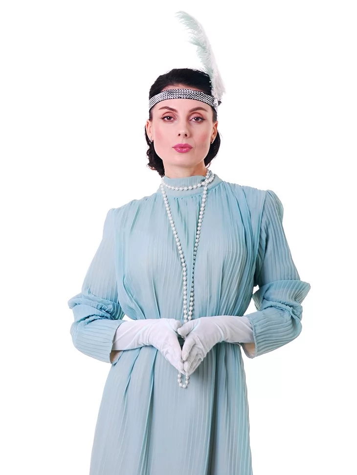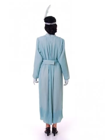 Цей елегантний образ у стилі New Look 1950-х років втілює жіночність, стриманий шик і післявоєнну моду великого міста. Плавний силует сукні з підкресленою талією та м’якою довжиною створює класичний образ світської пані середини ХХ століття. Перо в зачісці, довге намисто та рукавички додають настрою богемного шику та впізнаваної естетики 50-х. Це стильний варіант для оренди карнавальних костюмів на фотосесії, тематичні вечірки й сценічні образи.