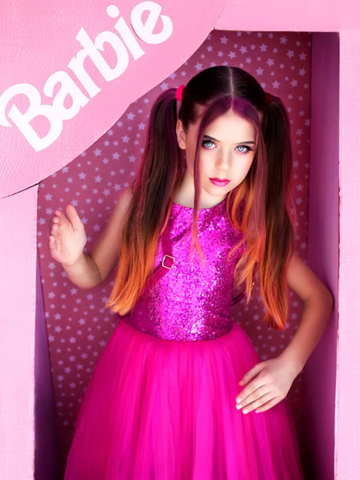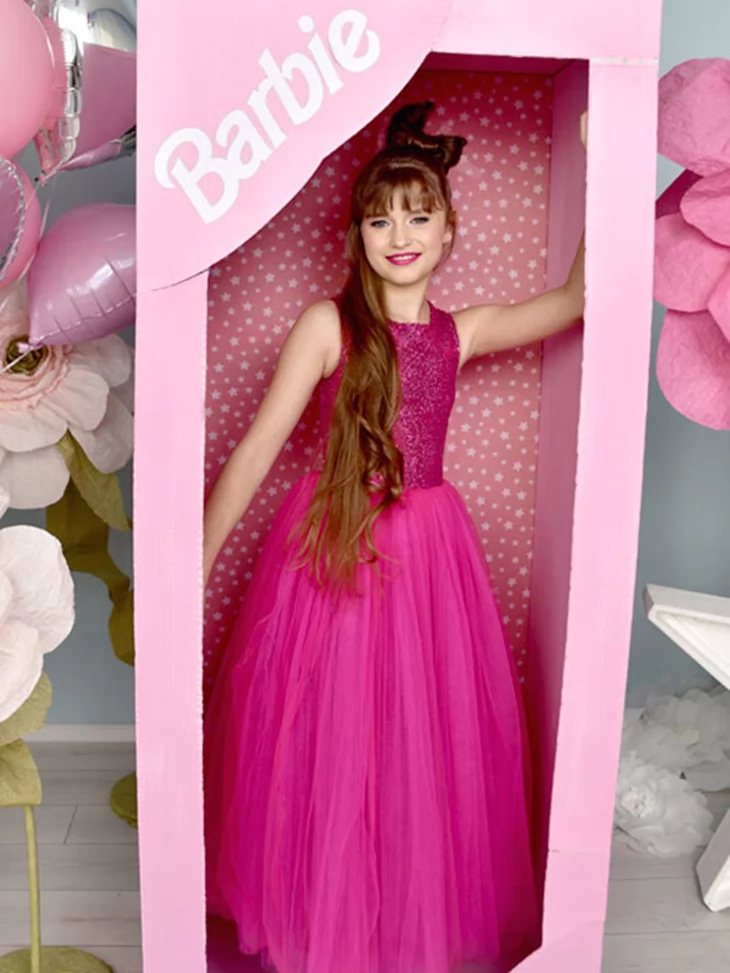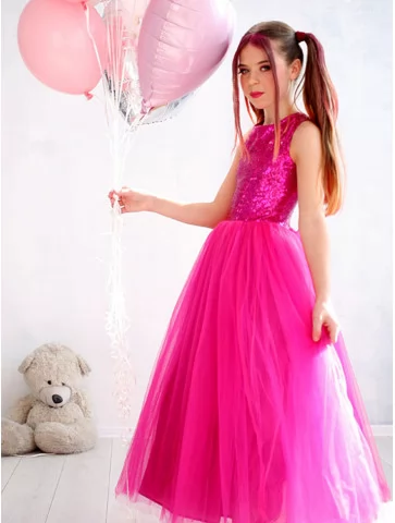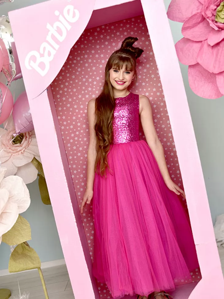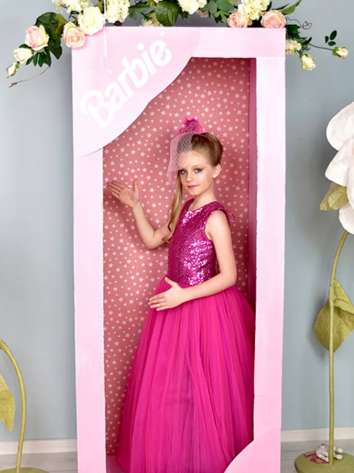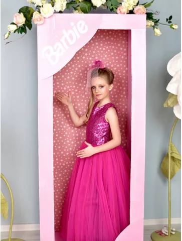 Яскравий та стильний образ у дусі класичної Барбі, що поєднує блиск, ніжність і святкову елегантність.Верх сукні з яскравих рожевих паєток красиво сяє на світлі, а довга фатінова спідниця створює легкий і повітряний силует. Такий образ виглядає дуже ефектно та ідеально підходить для оренди карнавальних костюмівна святкові події, фотосесії та тематичні вечірки.