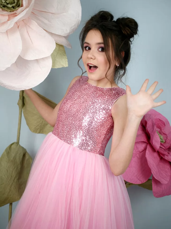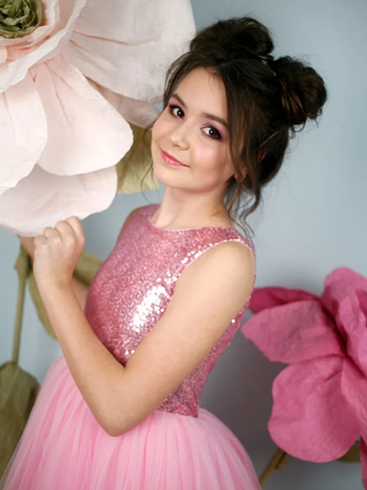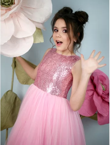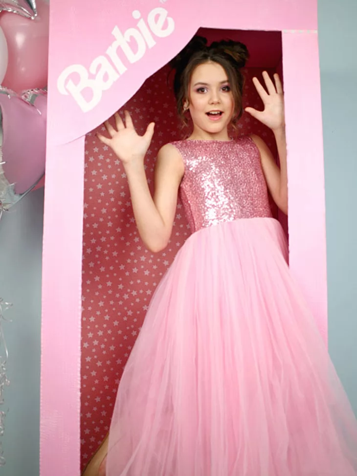 Стильний та ефектний образ у справжньому барбі-стилі, що поєднує блиск, ніжність і сучасну моду.Блискучий верх із паєтками та пишна фатінова спідниця створюють яскравий силует маленької модниці. Такий образ виглядає дуже святково та чудово підходить для оренди карнавальних костюмів на тематичні вечірки, фотосесії та дитячі свята.