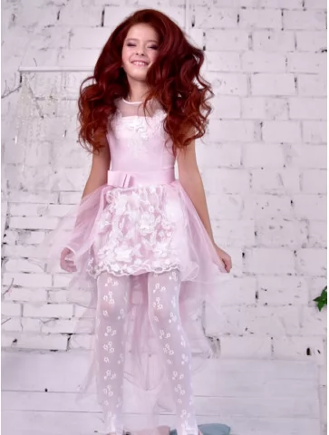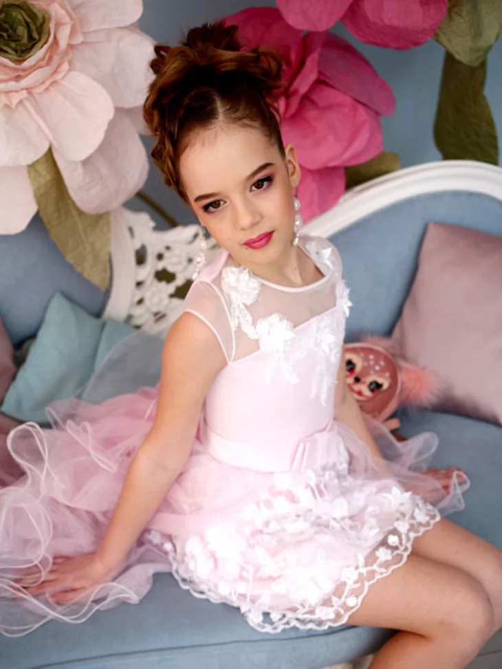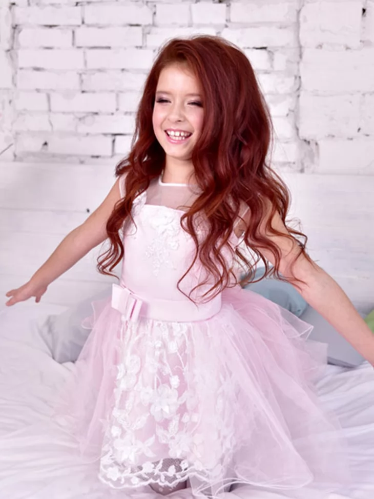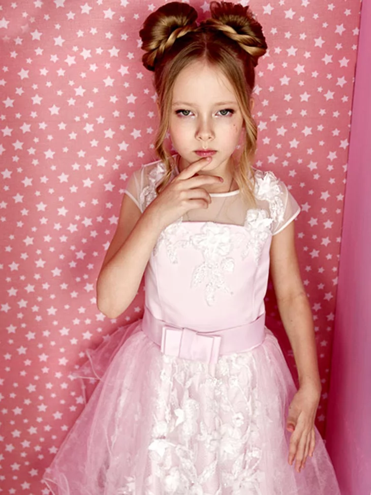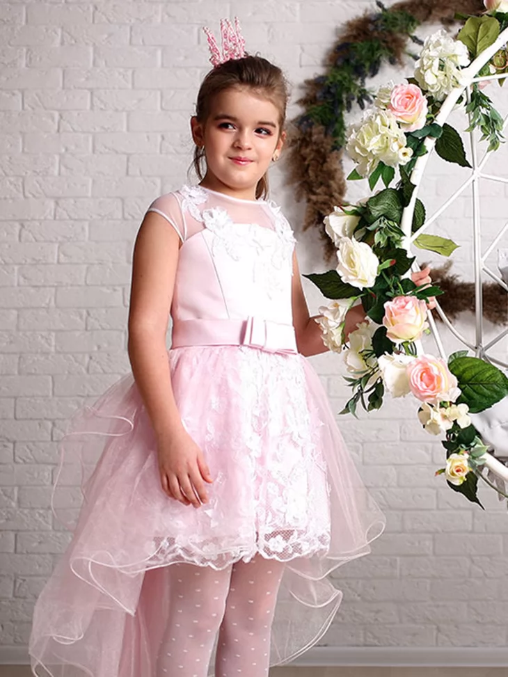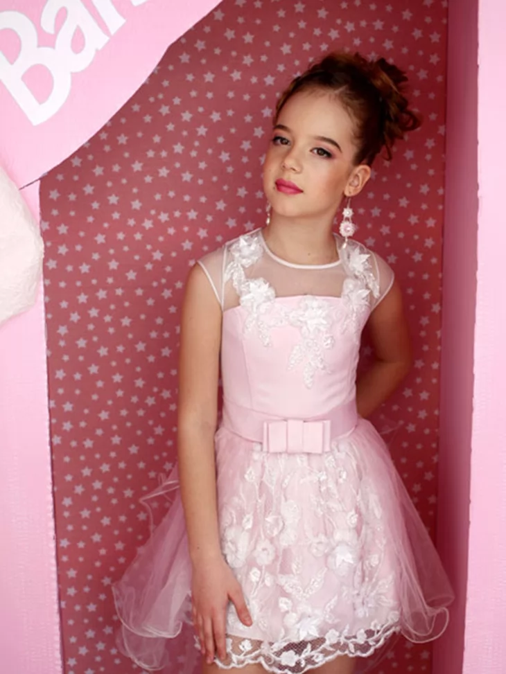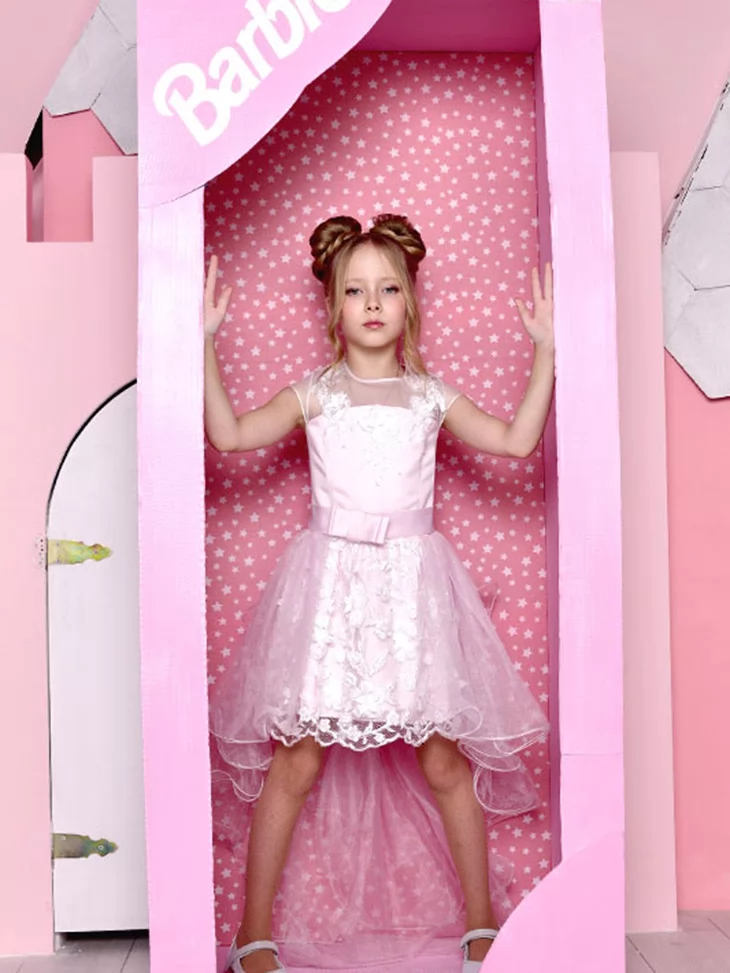 Легкий та чарівний образ у стилі Барбі, що поєднує ніжність, витонченість і сучасний святковий стиль. Світло-рожева сукня з мереживним декором та легкою фатіновою спідницею створює повітряний силует, який виглядає дуже романтично й елегантно. Такий образ чудово підходить для оренди карнавальних костюмів на дитячі свята, фотосесії та тематичні вечірки.