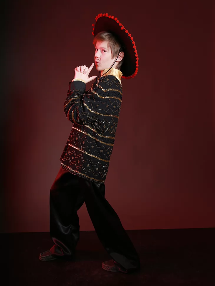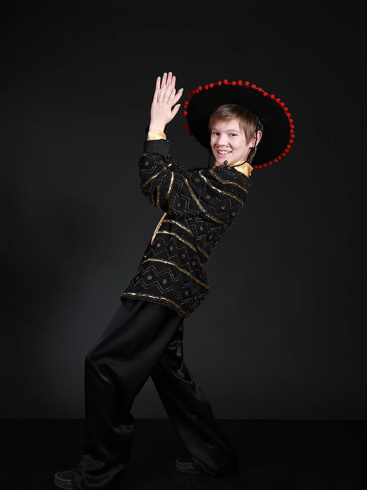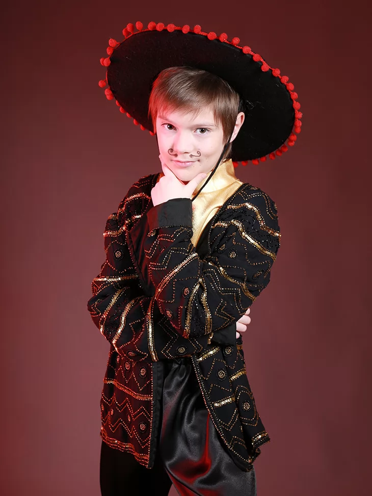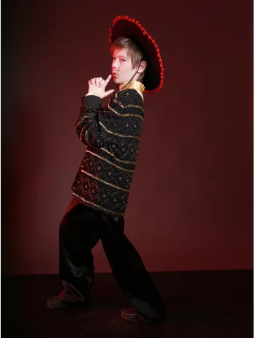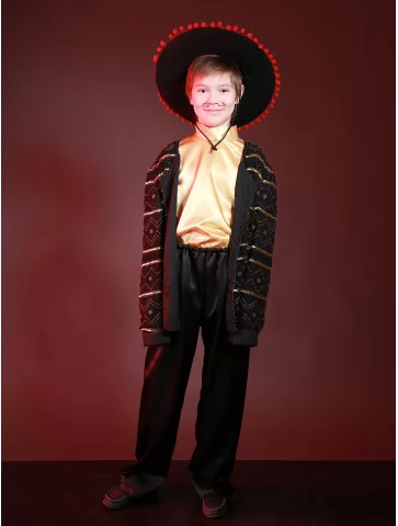 Цей колоритний образ ідеально підходить для виступів, де потрібен яскравий національний акцент. Сорочка з блиском, стильний піджак і широкі штани створюють ефектний образ Іспанця. Чудовий варіант для оренди карнавальних костюмів на концерти, шкільні постановки, тематичні заходи та фотосесії.