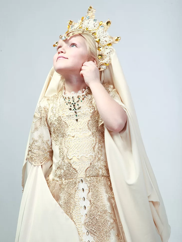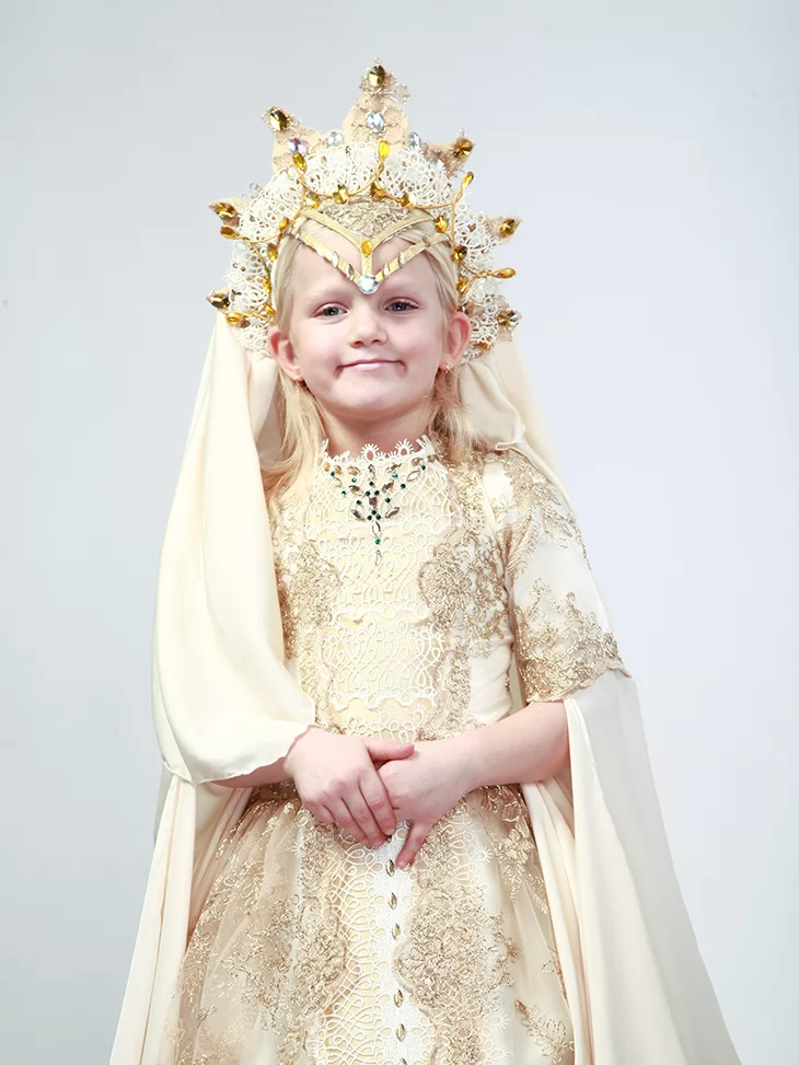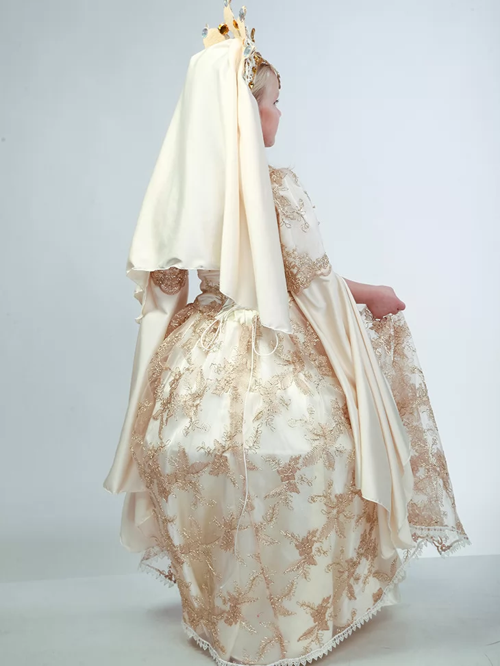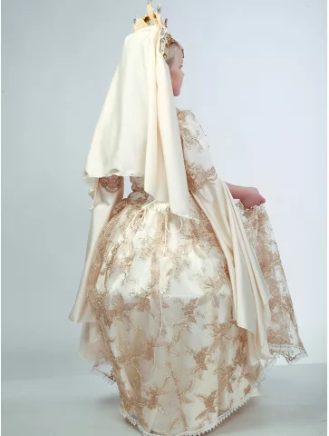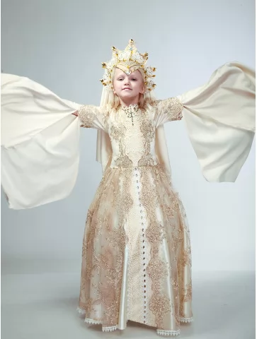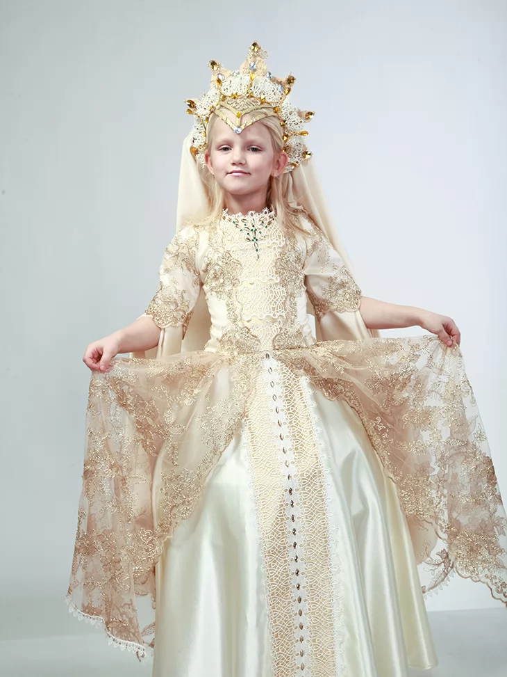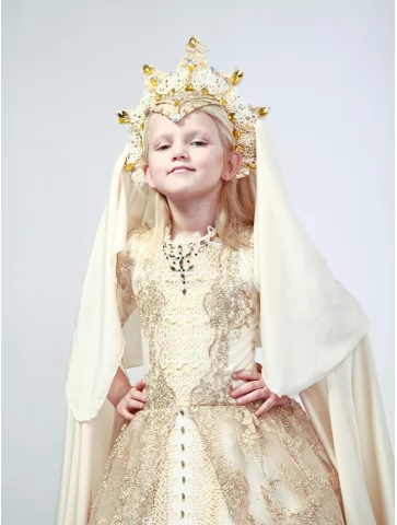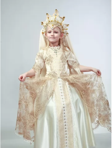 Розкішний, витончений та по-справжньому королівський образ, що переносить у світ палаців, легенд і східної магії. Цей костюм створений для тих, хто хоче виглядати велично, благородно й казково водночас. М’які кремово-золоті відтінки, багатий мереживний декор і висока корона з вуаллю формують образ справжньої східної цариці, гідної трону. Сукня виглядає святково та дуже фотогенічно, легко рухається і красиво підкреслює силует. Це ідеальний вибір для оренда карнавальних костюмів, коли потрібен не просто наряд, а цілісний образ зі статусом і характером.