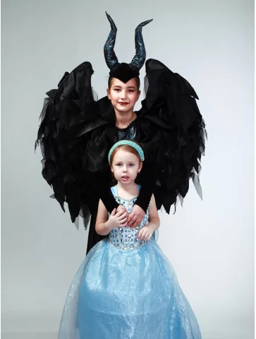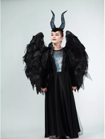 Величний образ із крилами, що вражає силою та магією. Цей костюм у стилі Малефісенти створений для ефектних виходів та атмосферних перевтілень. Довга чорна сукня з контрастною блискучою вставкою додає образу глибини, а масивні крила формують драматичний силует. Головний убір із високими рогами завершує містичний образ, надаючи йому впевненості та королівської величі. Чудовий вибір для оренди карнавальних костюмів на Хелловін, тематичні вечірки та фотосесії.