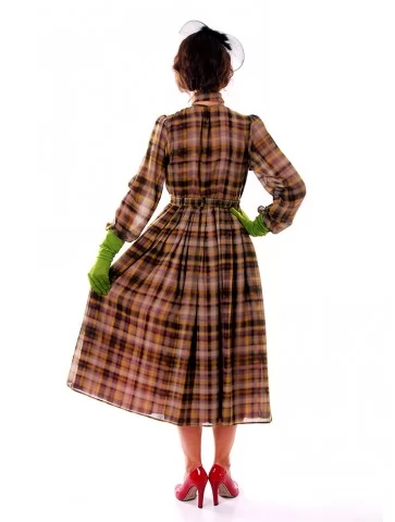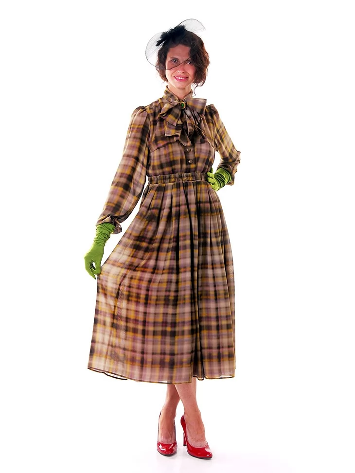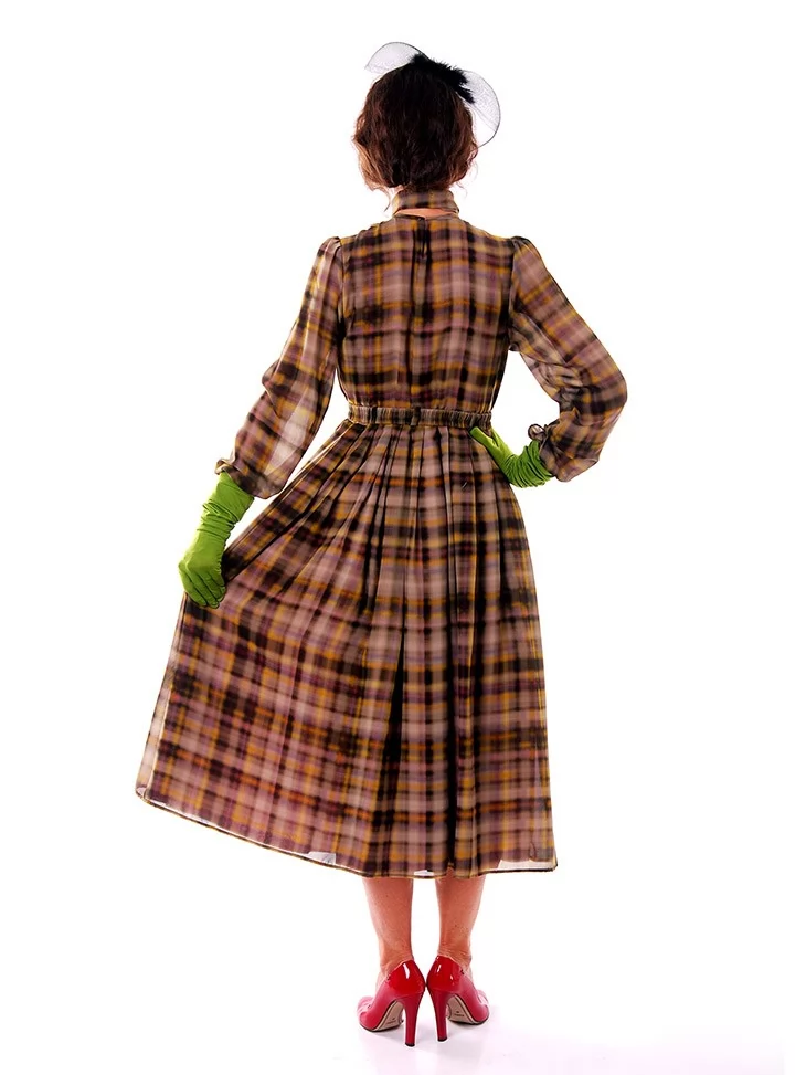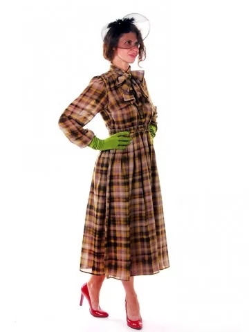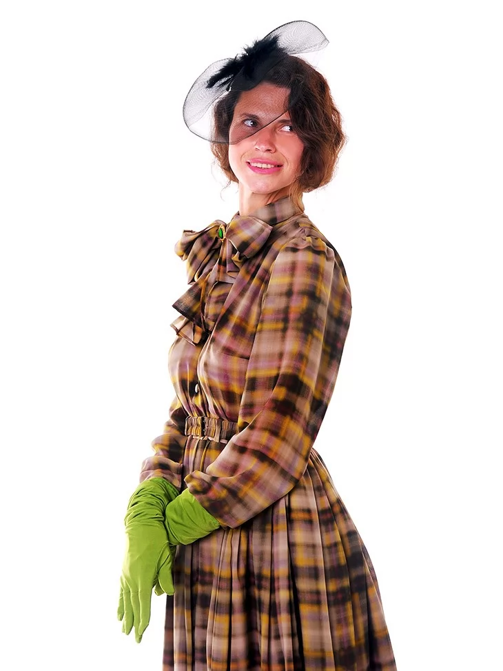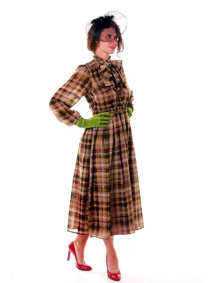 Грайливий і водночас вишуканий образ у стилі культового New Look 50-х років. Клітинчаста сукня з м’яко окресленою талією та пишною спідницею створює жіночний силует і передає характер епохи, коли мода поєднувала стриману елегантність і легку кокетливість. Вуалетка додає ретро-шарму, а рукавички завершують образ справжньої міської пані. Ідеальний вибір для оренди карнавальних костюмів, коли хочеться виглядати нестандартно й стильно.