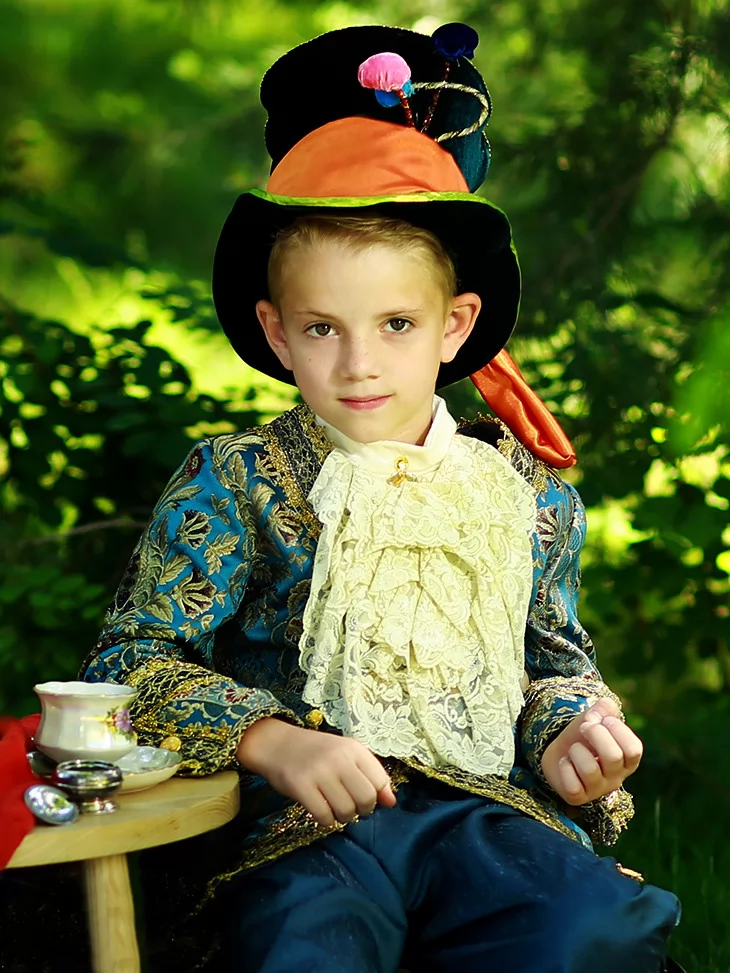 Цей яскравий та харизматичний образ одразу переносить у чарівний світ Аліси, де кожна деталь має свою магію. Розкішний камзол, стильні штани та ефектний капелюх створюють впізнаваний образ Капелюшника — ідеальний варіант для оренди карнавальних костюмів на свята, виступи, фотосесії та тематичні вечірки.