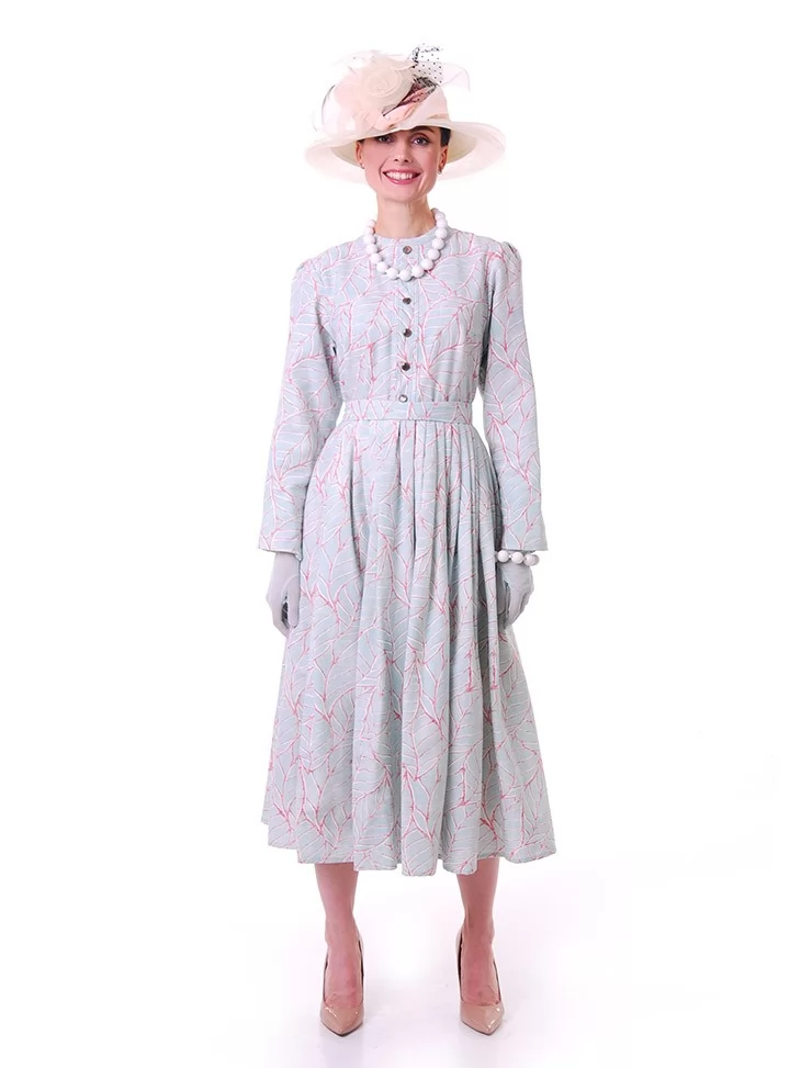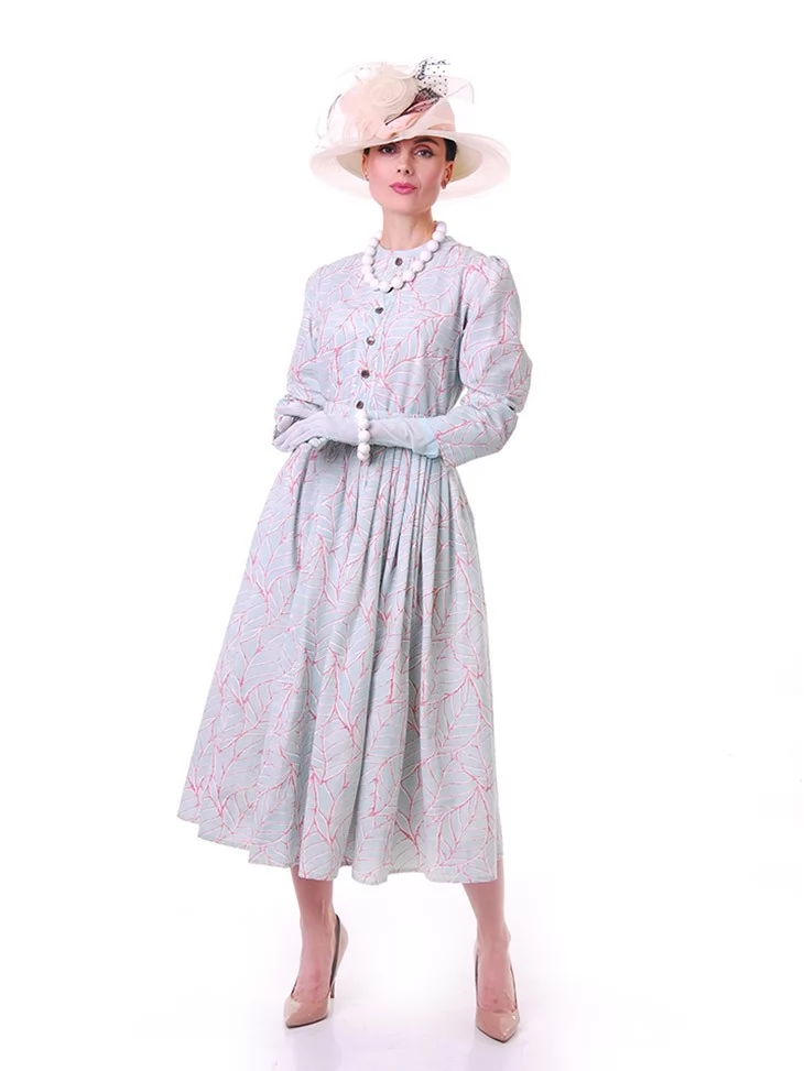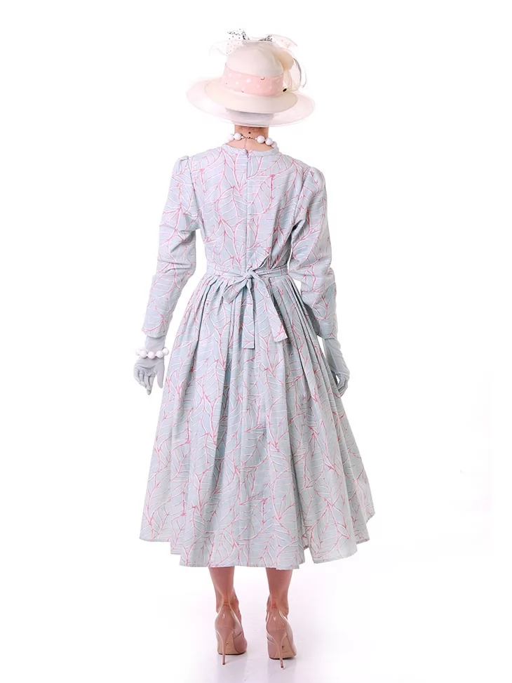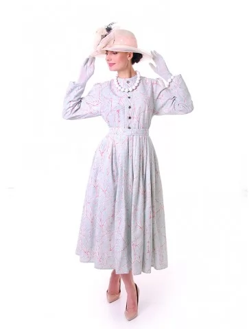 Ніжний, жіночний і дуже елегантний образ у стилі культових 50-х років. Світла сукня з делікатним візерунком, м’яка лінія плечей і акцент на талії створюють класичний силует New Look — витончений, стриманий та аристократичний. Образ виглядає легким і святковим, ідеально передаючи атмосферу післявоєнної моди. Це вдалий вибір для оренди карнавальних костюмів на події, де важлива естетика та стиль.