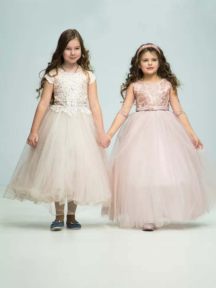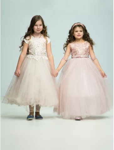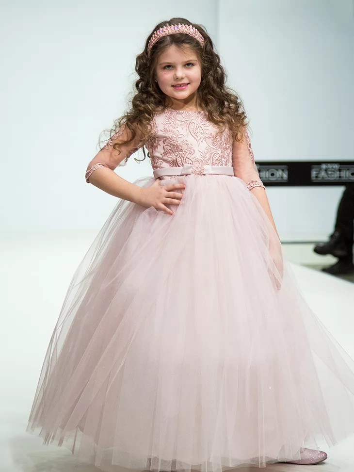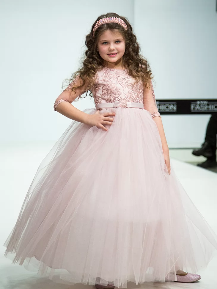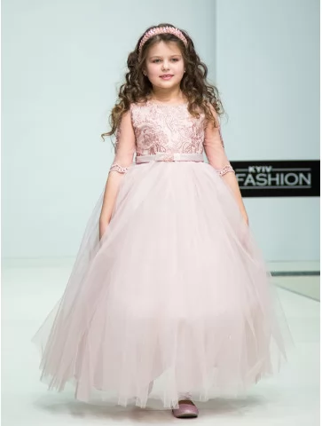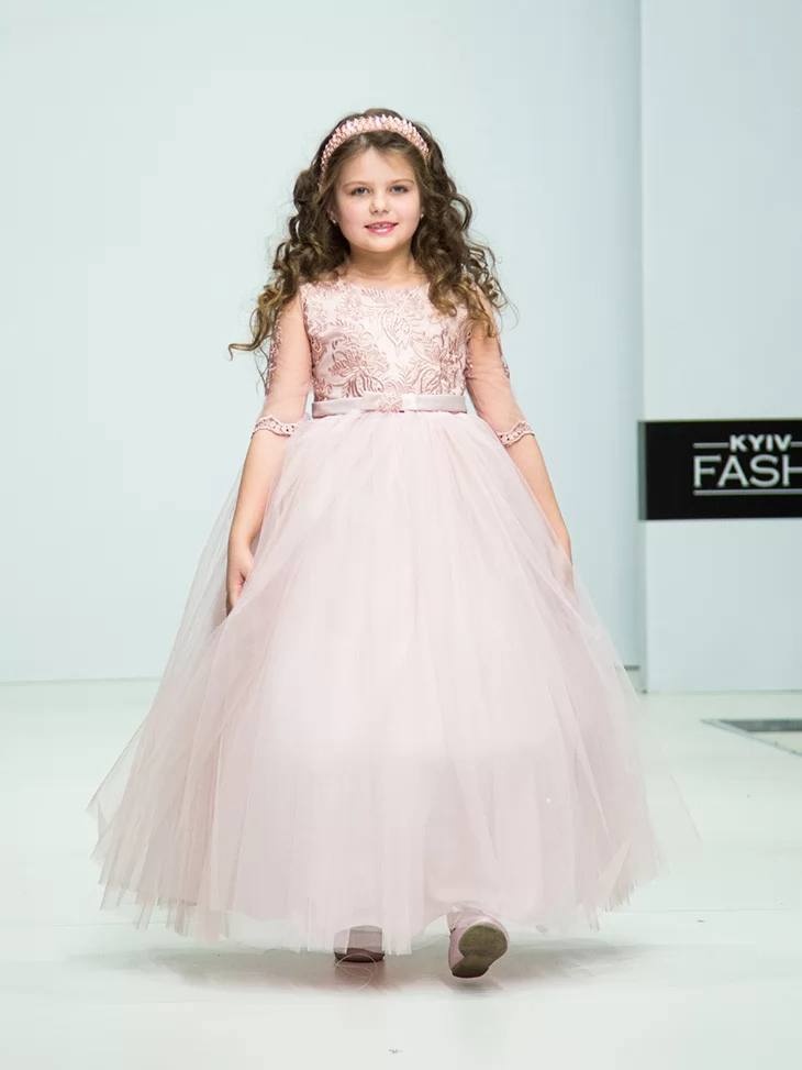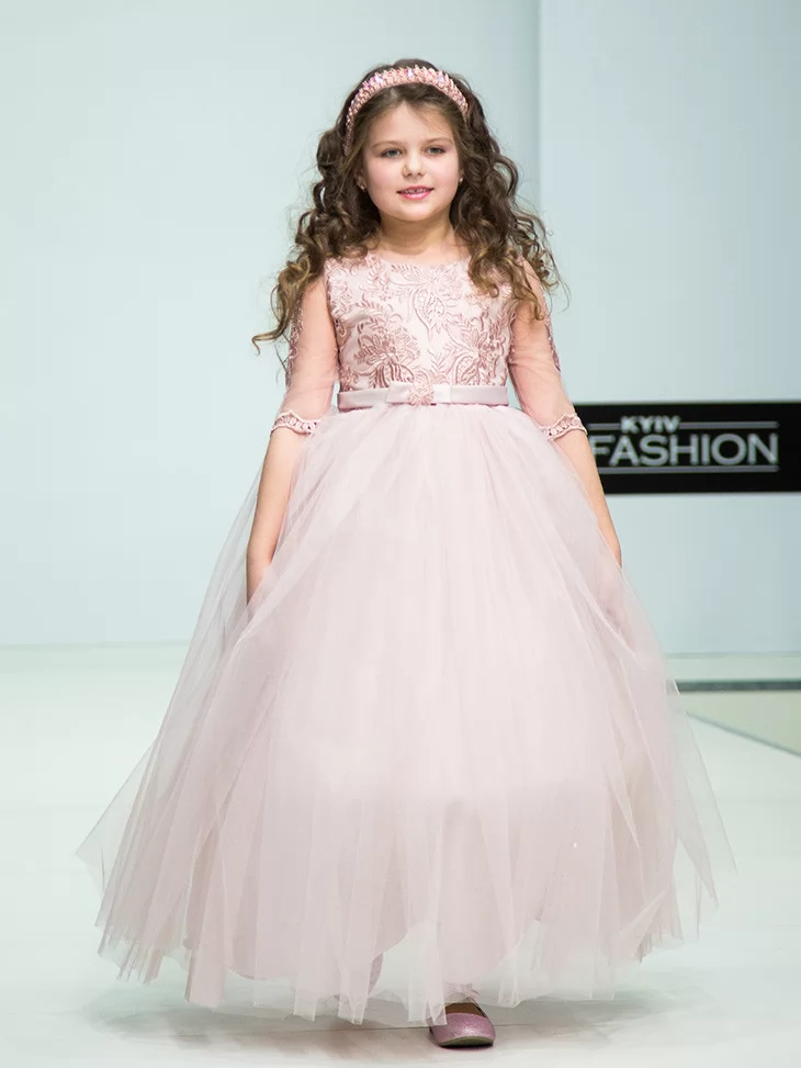 Витончений образ справжньої маленької леді, що випромінює ніжність, легкість і королівську елегантність. Пудрово-рожева сукня з мереживним вишитим верхом, напівпрозорими рукавами та довгою пишною фатиновою спідницею створює казковий силует для особливих моментів. Це ідеальний варіант для оренди карнавальних костюмів на урочисті події, фотосесії, виступи та святкові заходи, де важлива естетика й ніжність образу.