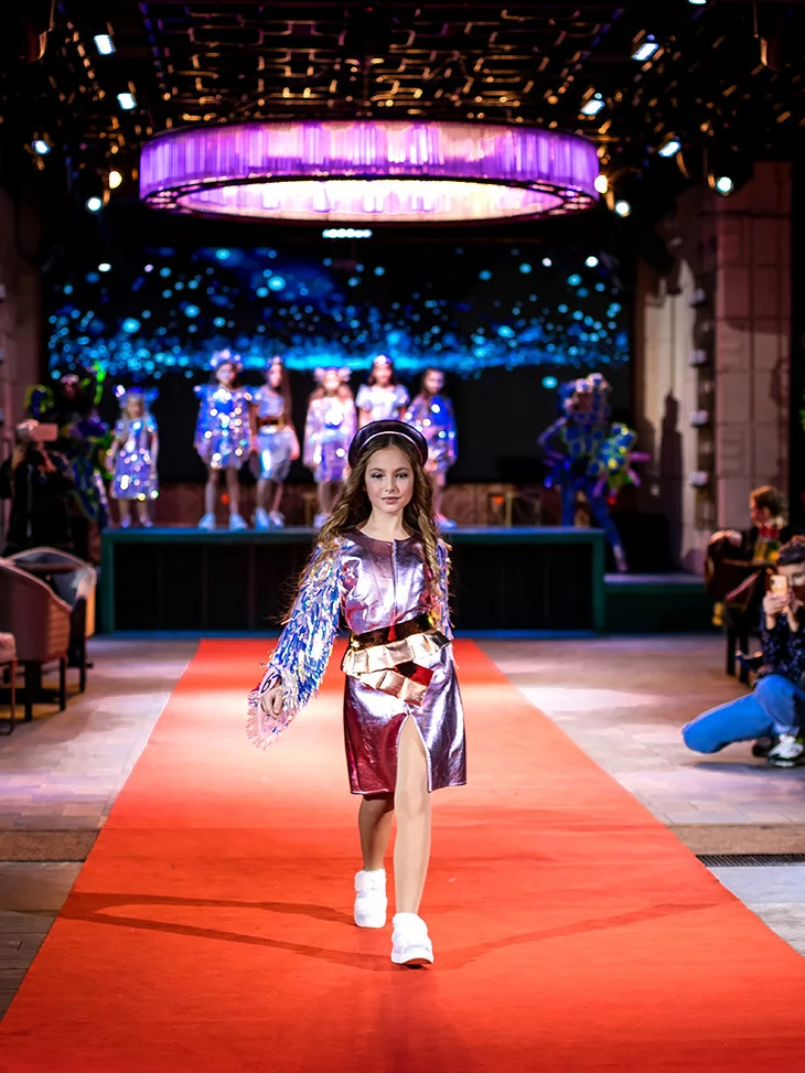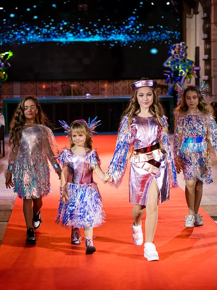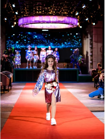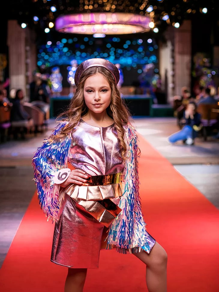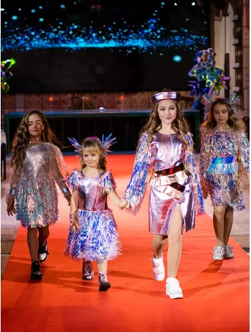 Поєднання металевого блиску, футуристичних акцентів та подіумної впевненості. Цей образ із колекції «Голограма» створений для яскравих виходів на сцену. Металізована сукня у відтінку рожевого неону ефектно переливається під світлом софітів, а голографічні рукави додають динаміки та об’єму. Акцентний блискучий пасок підкреслює силует і робить образ ще більш виразним. Ідеальний варіант для оренди карнавальних костюмів на конкурси, fashion-покази та святкові заходи.