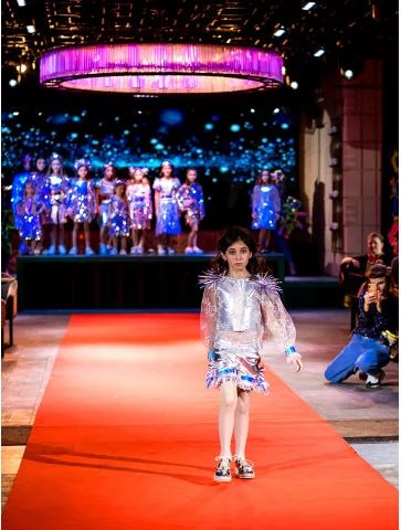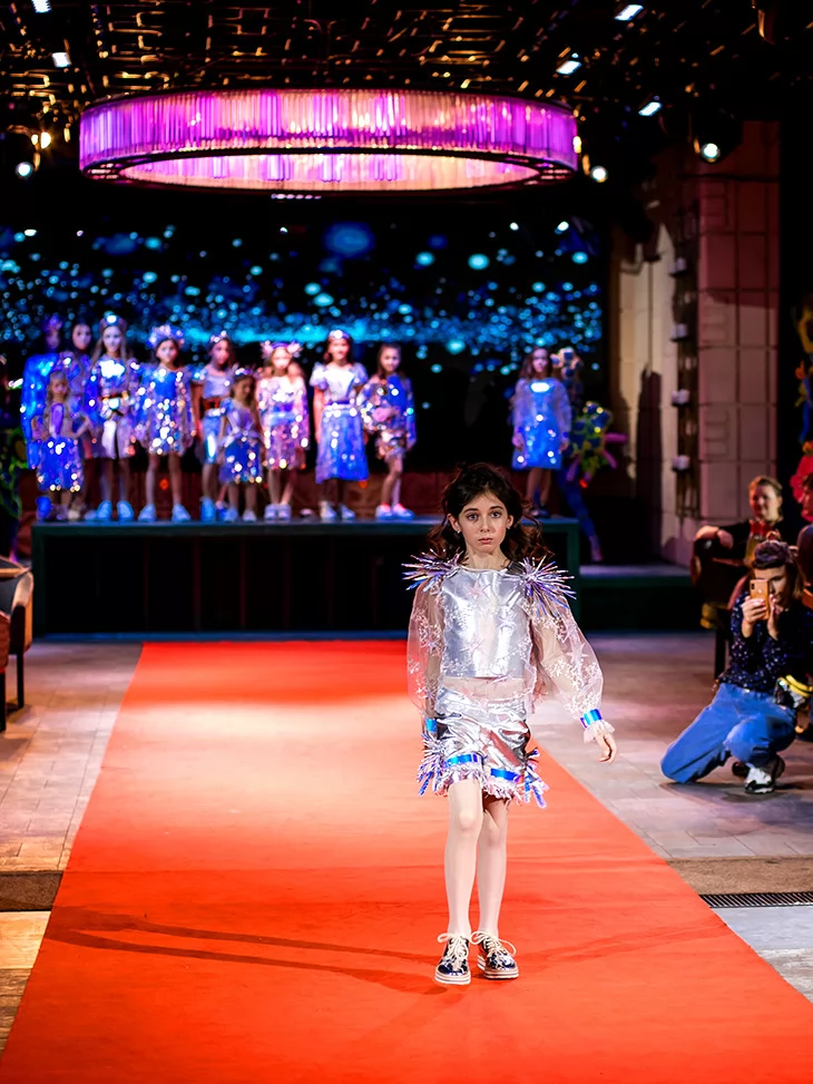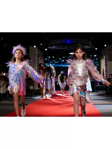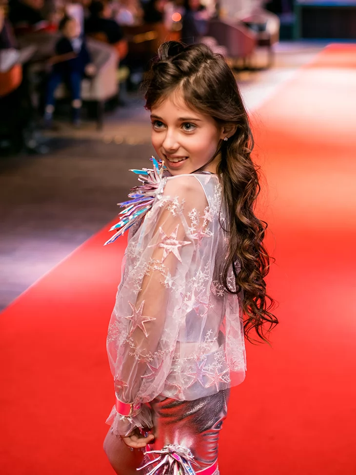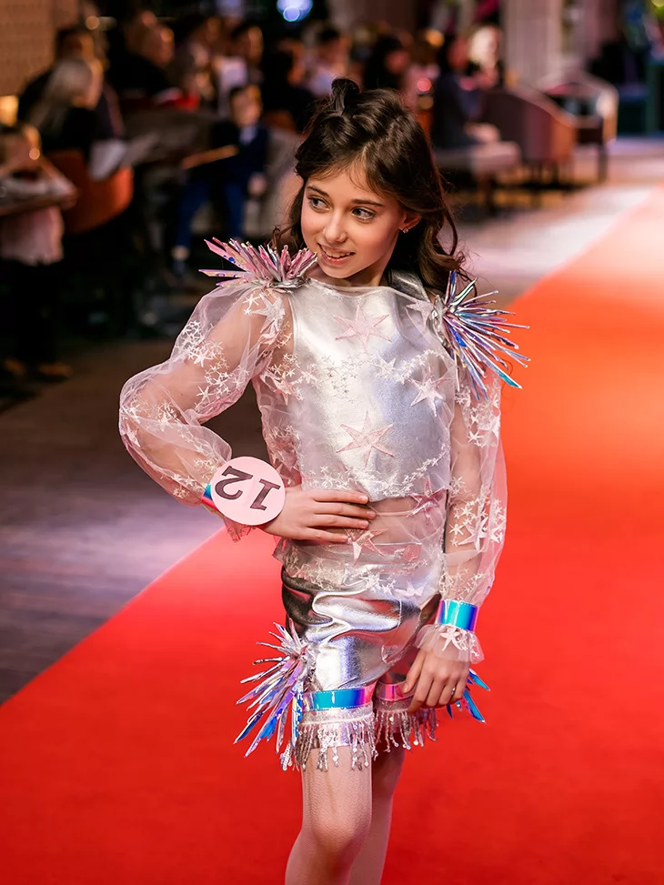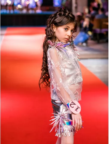 Футуристичний настрій, прозорість світла й динаміка сцени в одному образі. Цей костюм із колекції «Голограма» створений для яскравих виступів та модних показів. Напівпрозорий топ із делікатним візерунком зірок поєднується з металізованими шортами, що ефектно переливаються під світлом софітів. Об’ємні голографічні акценти на плечах і по низу додають образу сміливості та сценічної енергії. Чудовий варіант для оренди карнавальних костюмів на конкурси, шоу та фотосесії.