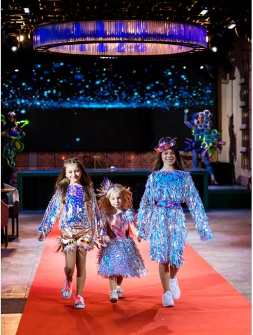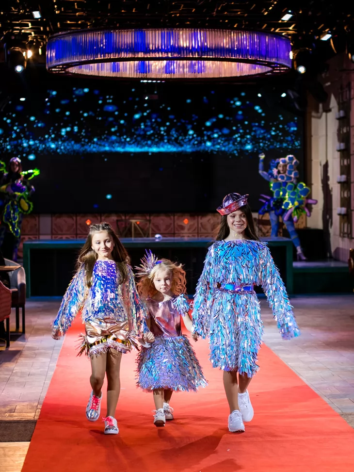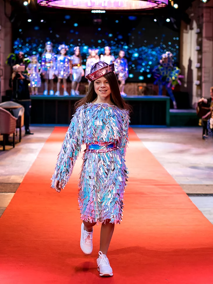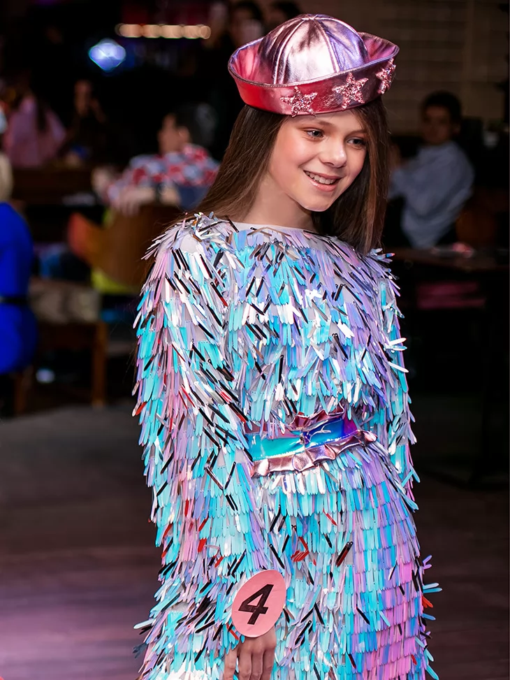 Сяйво неону, динаміка руху та справжній fashion-настрій. Цей костюм із колекції «Голограма» створений для яскравих виходів на сцену та подіум. Сукня повністю оздоблена голографічними стрічками, які переливаються блакитними, рожевими та сріблястими відтінками під світлом софітів. Контрастний переливчастий пасок підкреслює силует, а стильний головний убір додає образу характеру та завершеності. Ідеальний варіант для оренди карнавальних костюмів на конкурси, покази та святкові заходи.