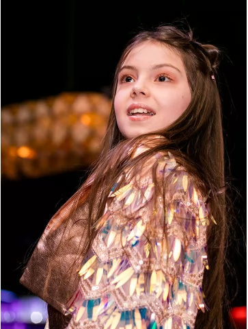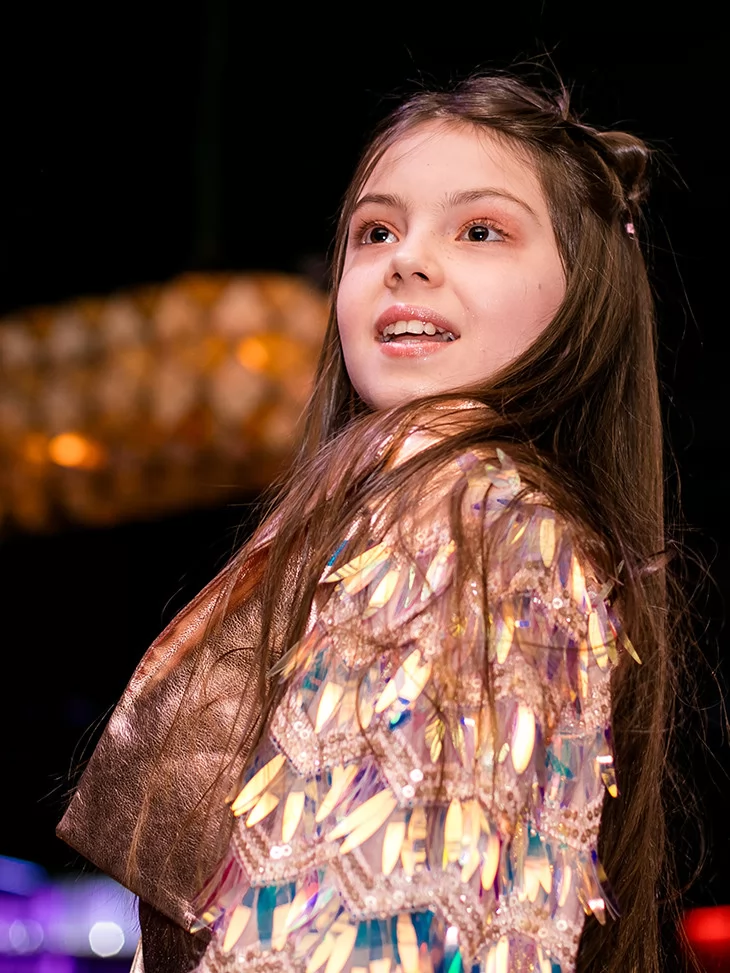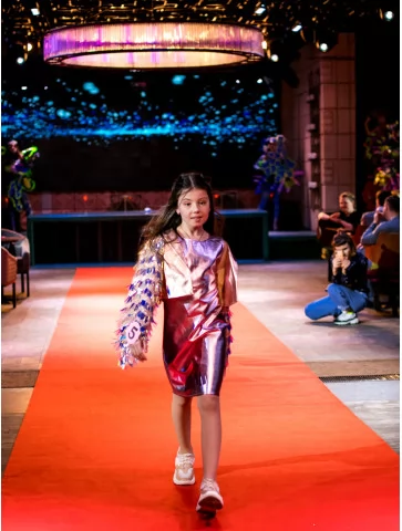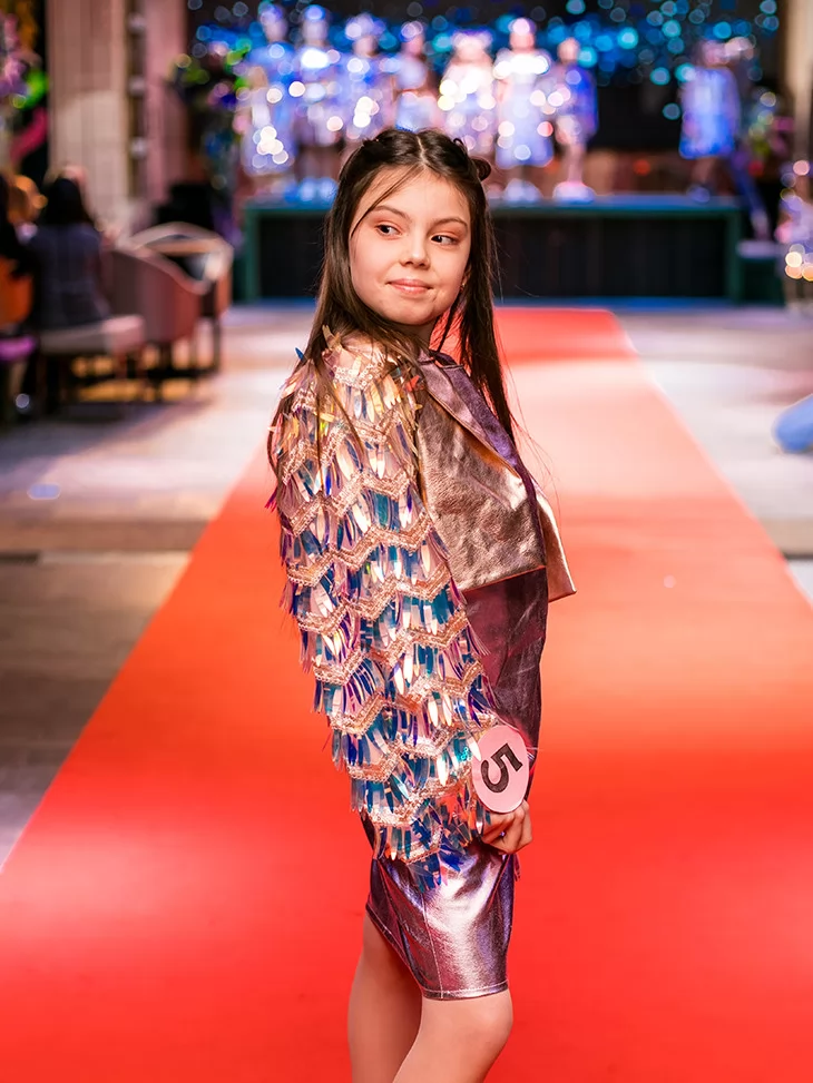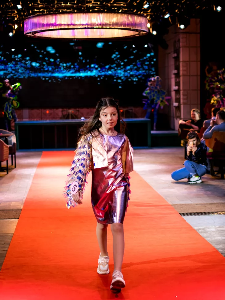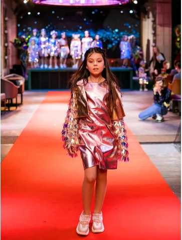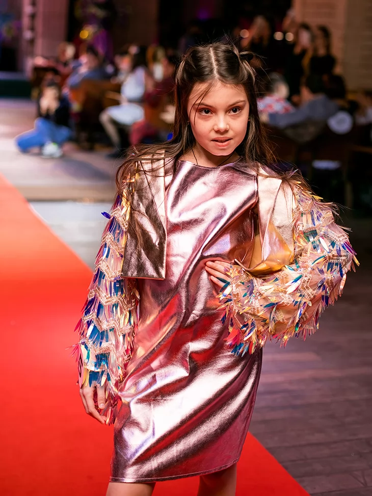 Сміливий металевий блиск і подіумна енергія в одному образі. Цей костюм із колекції «Голограма» створений для яскравих сценічних виходів. Металізована сукня у відтінку рожевого золота ефектно переливається під світлом софітів, а об’ємні голографічні рукави з декоративними елементами додають образу динаміки та характеру. Лаконічний силует у поєднанні з футуристичними акцентами виглядає сучасно й дуже виразно. Ідеальний варіант для оренди карнавальних костюмів на покази, конкурси та святкові події.