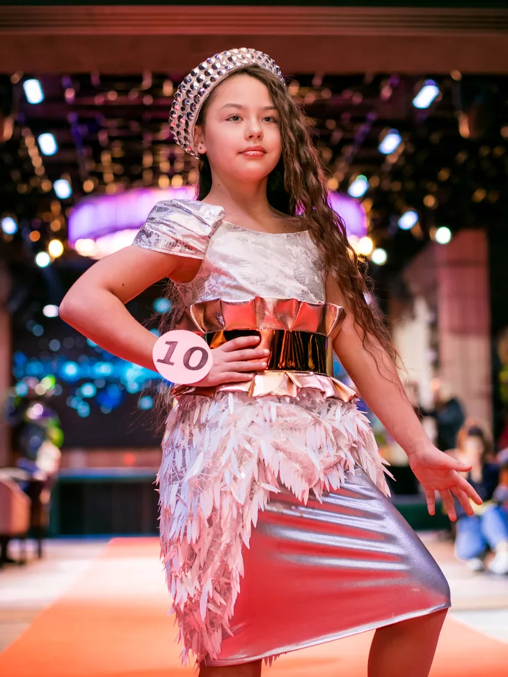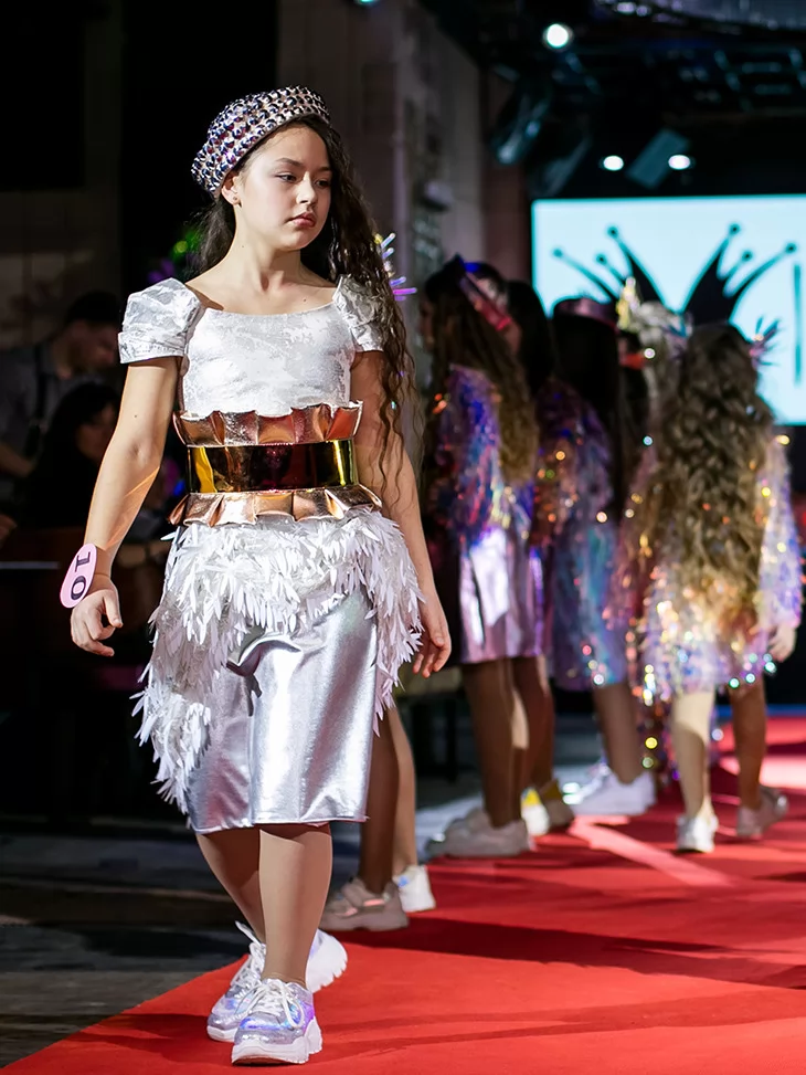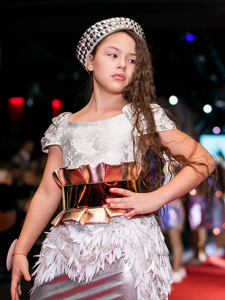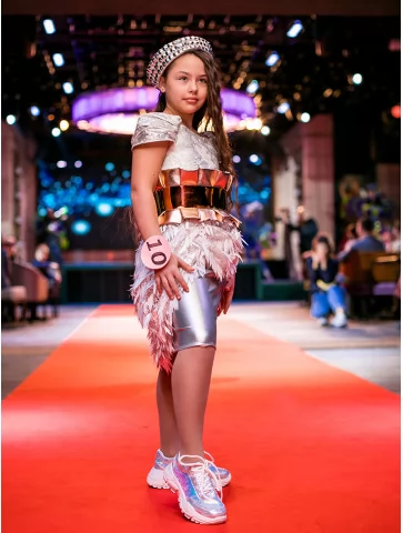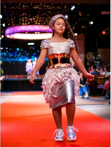 Стильний блиск металу та футуристичний характер у подіумному форматі. Цей образ із колекції «Голограма» поєднує стриману елегантність срібла з яскравим акцентом золотистого пояса. Сукня з металізованим низом і декоративним об’ємним оздобленням створює ефект руху та світла під час кожного кроку. Головний убір гармонійно доповнює силует і додає fashion-настрою. Ідеальний вибір для оренди карнавальних костюмів на конкурси, виступи та святкові події.