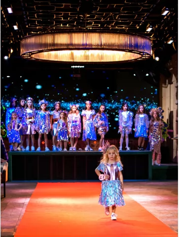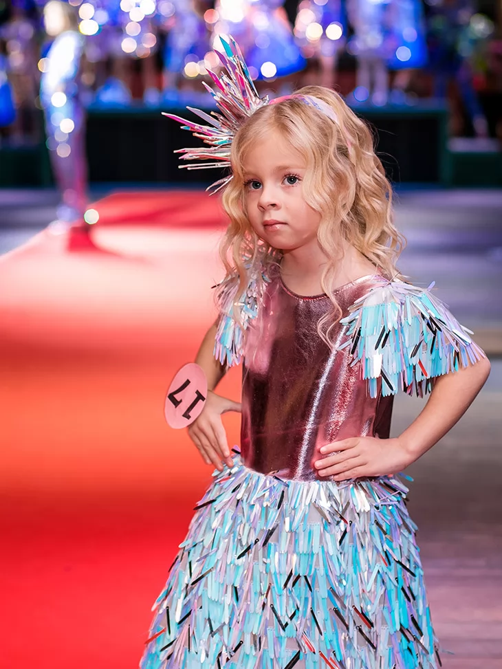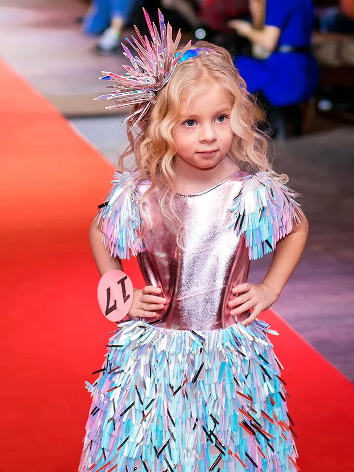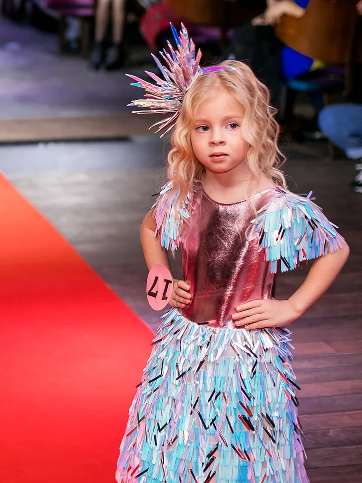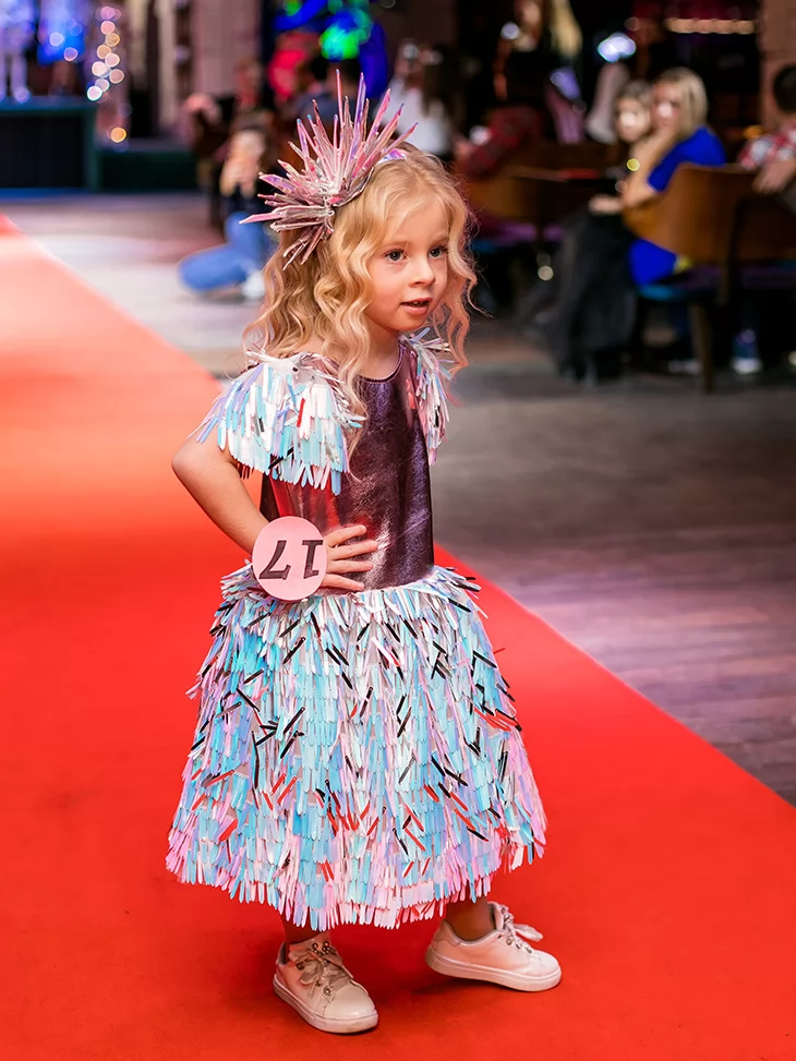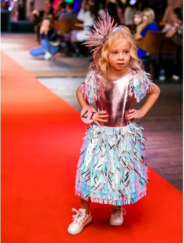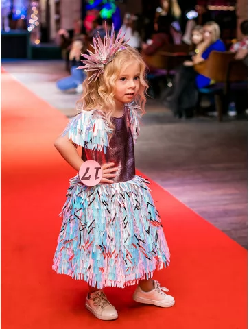 Яскравий, грайливий і по-справжньому подіумний образ для найменших fashion-леді. Цей костюм із колекції «Голограма» поєднує металізований верх у рожево-перламутровому відтінку з пишною спідницею з голографічних стрічок, що переливаються блакитними, лавандовими та сріблястими тонами. Декоративні акценти на плечах і стильний сяючий головний убір додають образу святкового настрою та сценічної виразності. Чудовий вибір для оренди карнавальних костюмів на конкурси, покази та яскраві дитячі події.