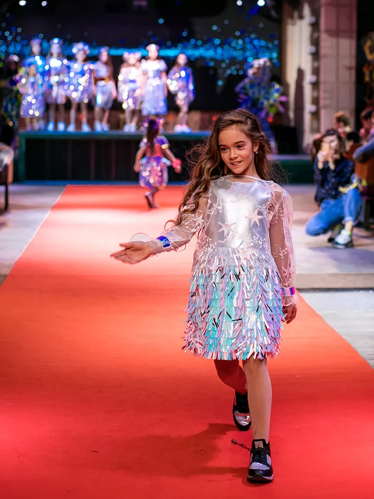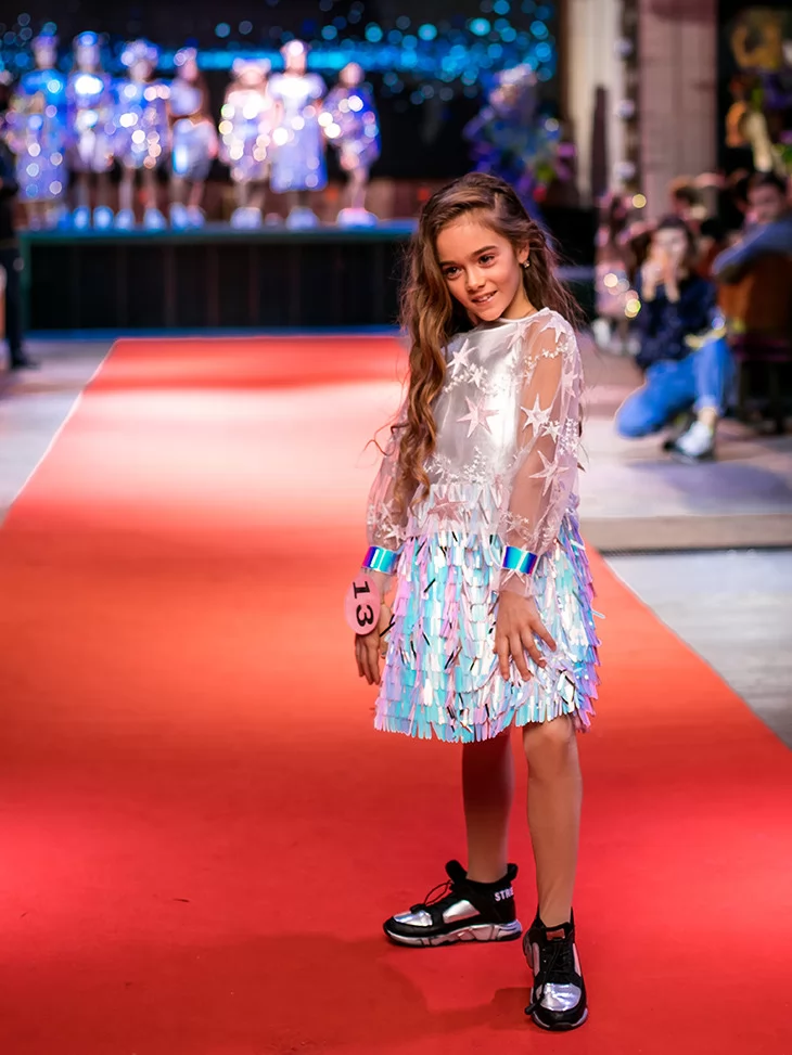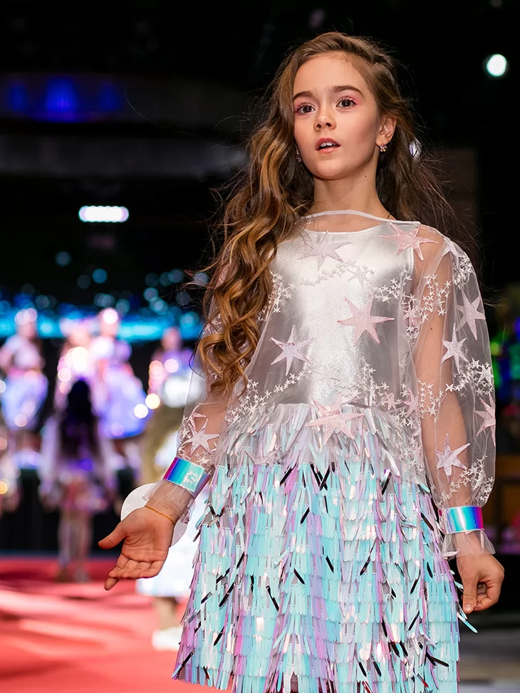 Ніжне сяйво зірок і футуристичний блиск у кожному русі. Цей костюм із колекції «Голограма» поєднує прозорий верх із вишитими зірками та сяючу багатошарову спідницю з голографічним ефектом. Легкі рукави додають образу повітряності, а переливи блакитних, перламутрових і сріблястих відтінків створюють справжній wow-ефект під сценічним світлом. Ідеальний варіант для оренди карнавальних костюмів на покази, конкурси та святкові виступи.