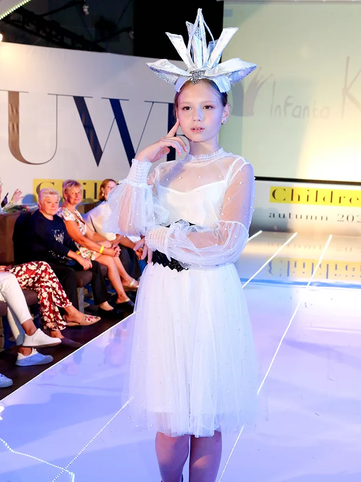Ефектний та урочистий образ, що нагадує сяйво вечірнього неба і світло яскравої сцени. Біла повітряна сукня з прозорими рукавами та декоративними перлинними акцентами виглядає дуже витончено, а головний убір у формі зірки створює справжній сценічний ефект. Такий образ ідеально підходить для оренди карнавальних костюмів на виступи, покази та святкові події.