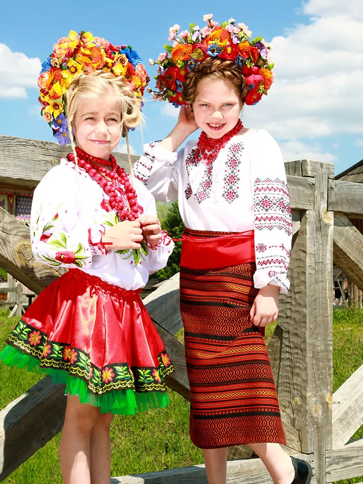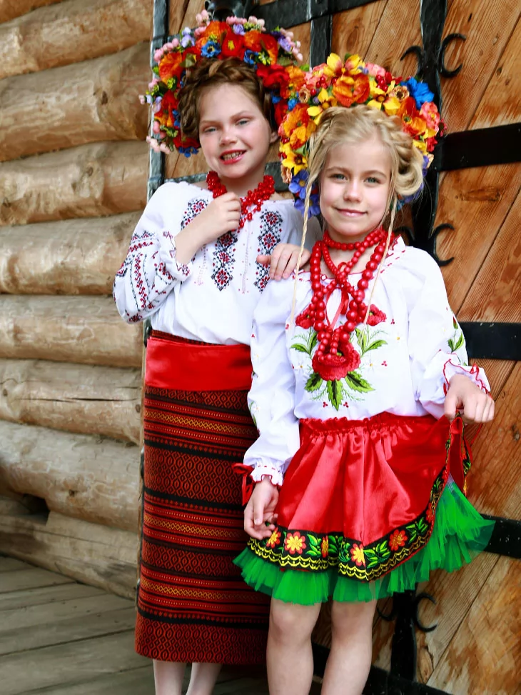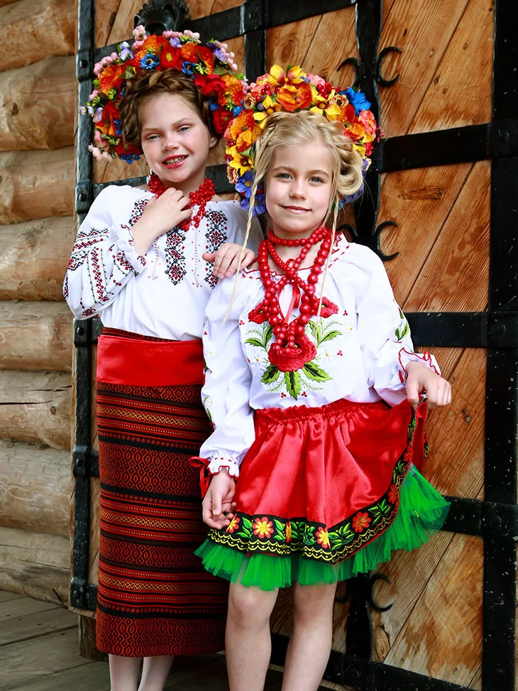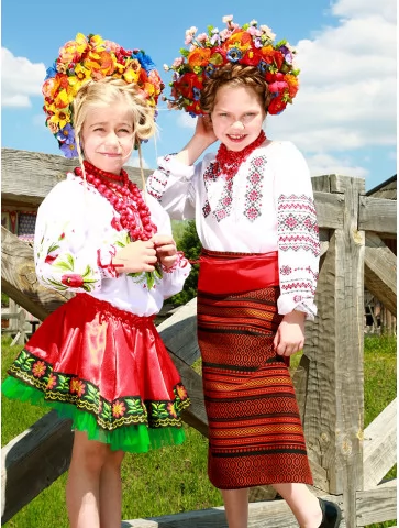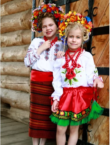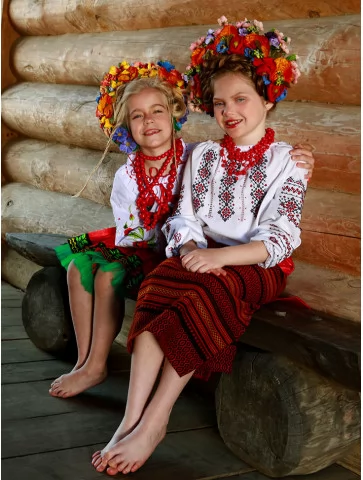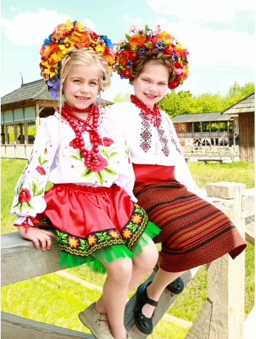 Живий, яскравий образ, у якому народна естетика розквітає у двох віках одночасно. Вишиті сорочки з червоно-чорними орнаментами, насичені спідниці з традиційним візерунком і пишні віночки з різнобарвних квітів створюють святкову композицію, що виглядає цілісно та дуже фотогенічно. Це вдале рішення для оренда карнавальних костюмів, коли потрібен один гармонійний текст і стиль для двох дітей.