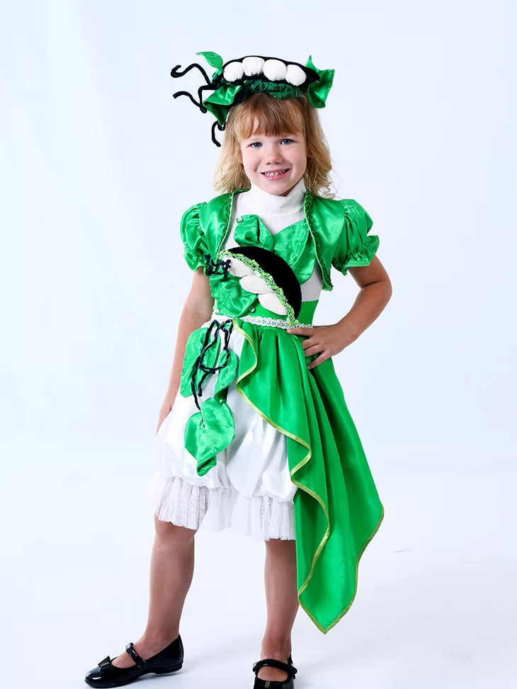 Свіжий, яскравий та по-дитячому чарівний образ, натхненний зеленим врожаєм і природною красою.Насичені смарагдові відтінки, декоративні листочки та витончений крій створюють легкий казковий настрій. Чудовий варіант для оренди карнавальних костюмів на осінні свята, ранки та тематичні виступи.