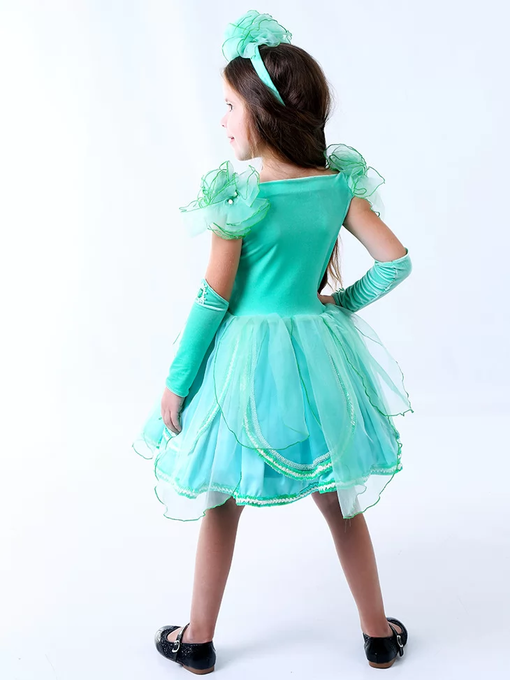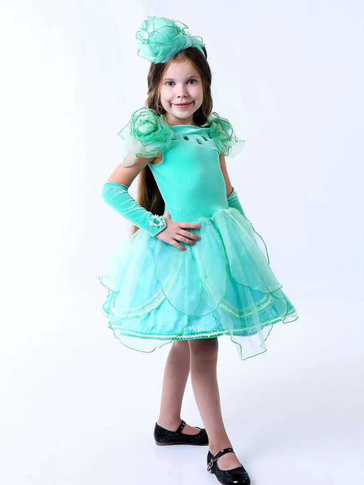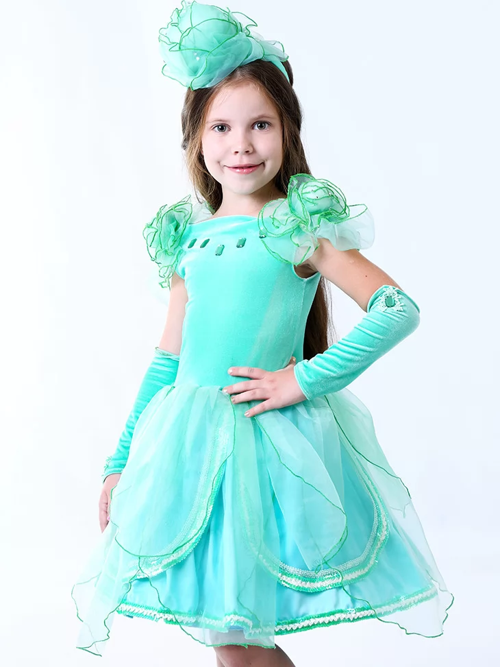 Легкий, свіжий та казково ніжний образ, що асоціюється з весною, природною красою та дитячою чарівністю. М’ятно-зелена сукня з повітряною спідницею та квітковими акцентами створює витончений силует, який виглядає святково й дуже фотогенічно. Такий варіант ідеально підходить для оренди карнавальних костюмів на осінні свята, ранки та тематичні виступи, де важлива ніжність і яскравий образ водночас.