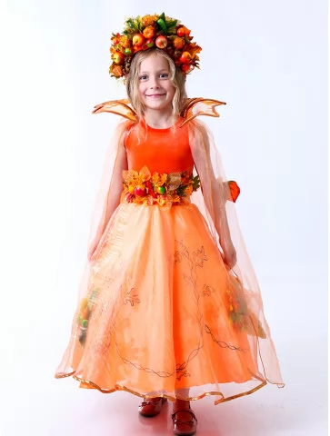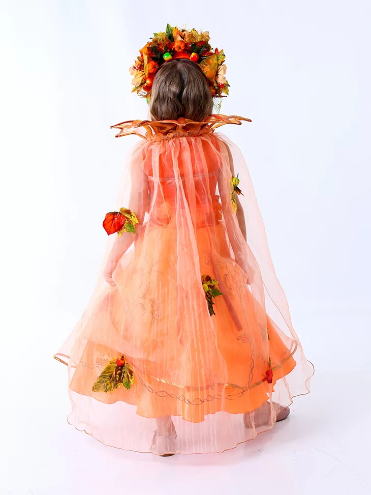 Яскравий, теплий образ, що нагадує про золоте листя, стиглі яблука та сонячні промені бабиного літа.Насичений помаранчевий відтінок сукні створює ефект вогняного сяйва, а легка прозора накидка додає руху та казковості. Об’ємний вінок із плодами та листям підкреслює святковий характер образу. Ідеальний вибір для оренда карнавальних костюмів на осінні ранки, тематичні виступи та фотосесії.