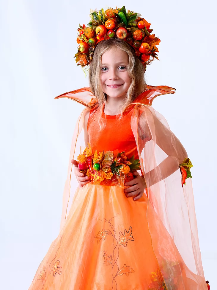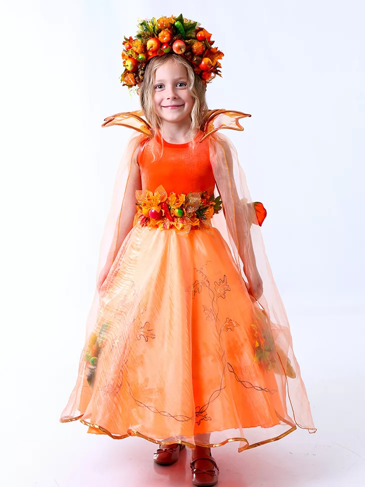 Образ виглядає урочисто, яскраво й дуже фотогенічно — чудовий варіант для прокат карнавальних костюмів та створення справжнього осіннього свята.