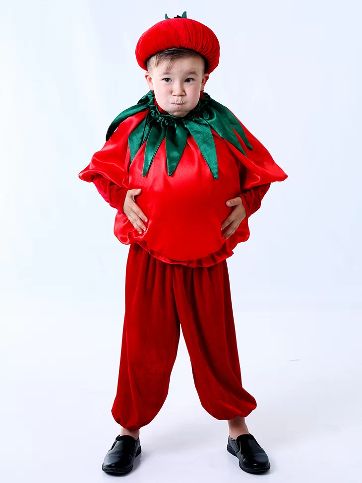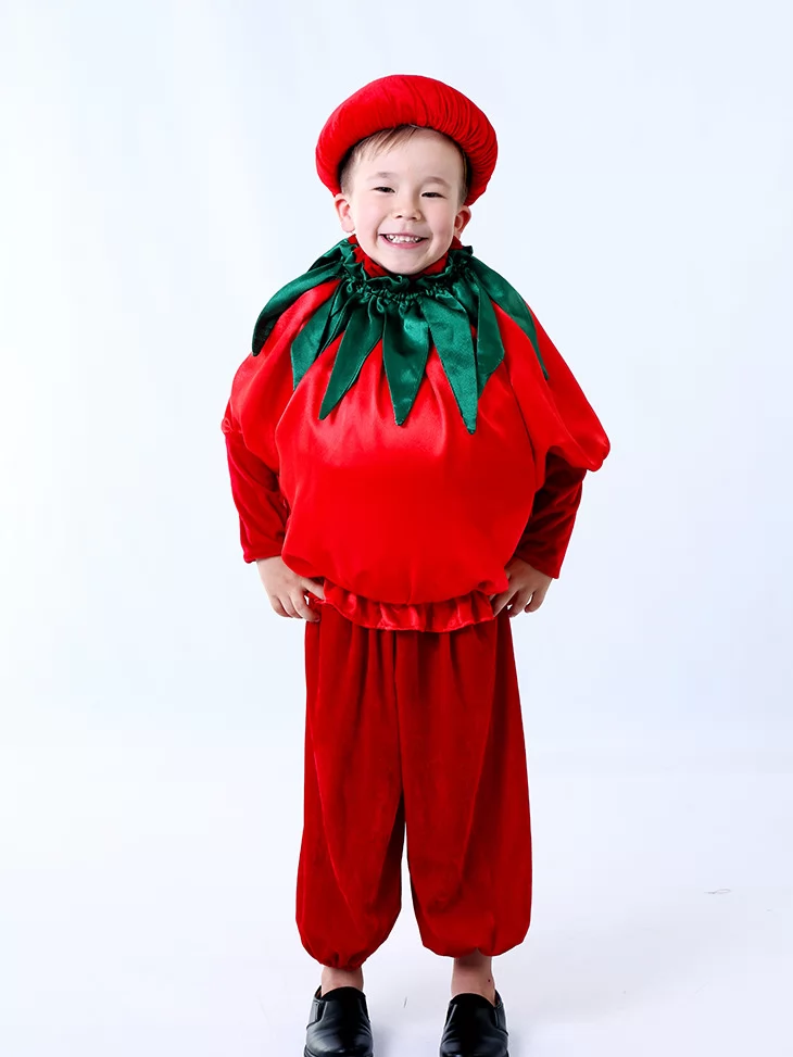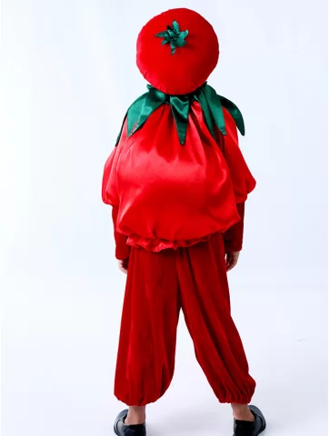Цей веселий та соковитий образ одразу створює святковий настрій і привертає увагу насиченим червоним кольором. Об’ємний силует, зелений комір у вигляді листочків і кумедна шапка формують впізнаваний овоч помідор. Чудовий варіант для оренди карнавальних костюмів на дитячі ранки, свята осені та тематичні заходи.