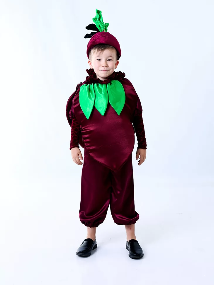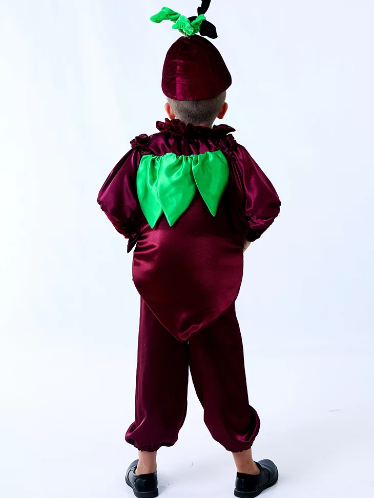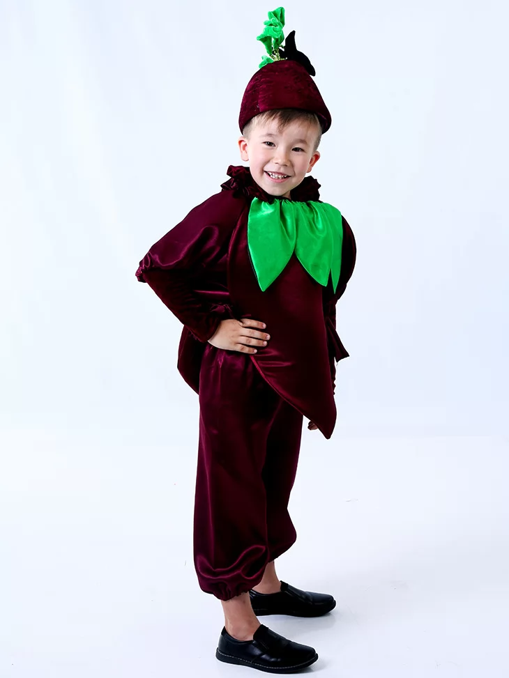 Цей кумедний та дуже виразний образ створений для веселих свят урожаю, дитячих ранків і казкових вистав. Насичений бордовий колір у поєднанні з зеленими “листочками” формує впізнаваний силует буряка, який одразу привертає увагу та дарує гарний настрій. Чудове рішення для оренди карнавальних костюмів.