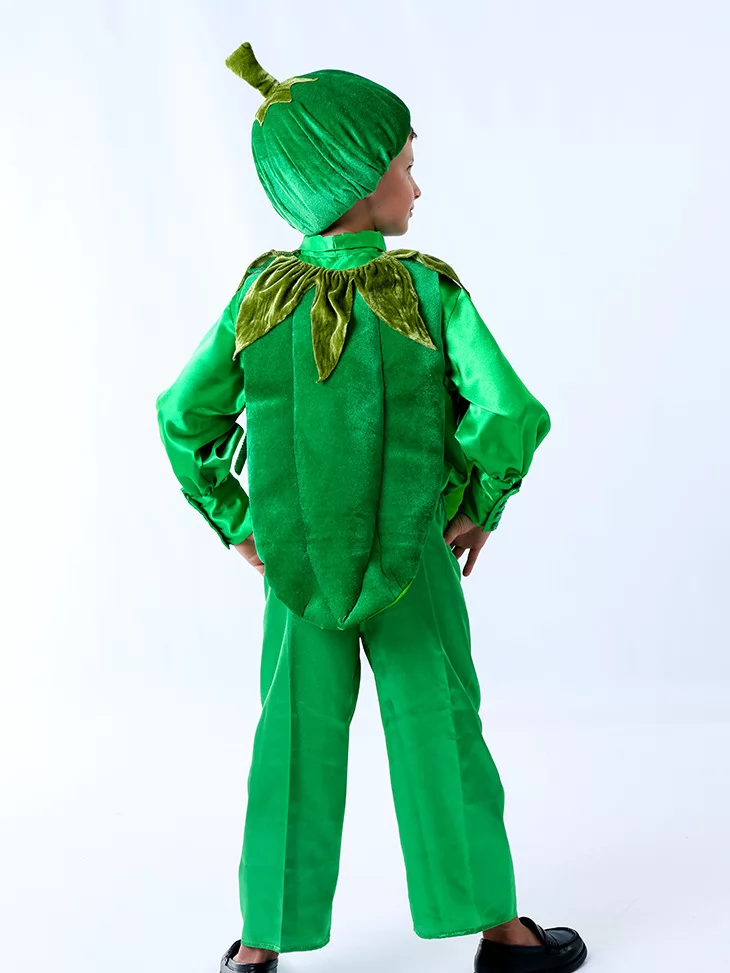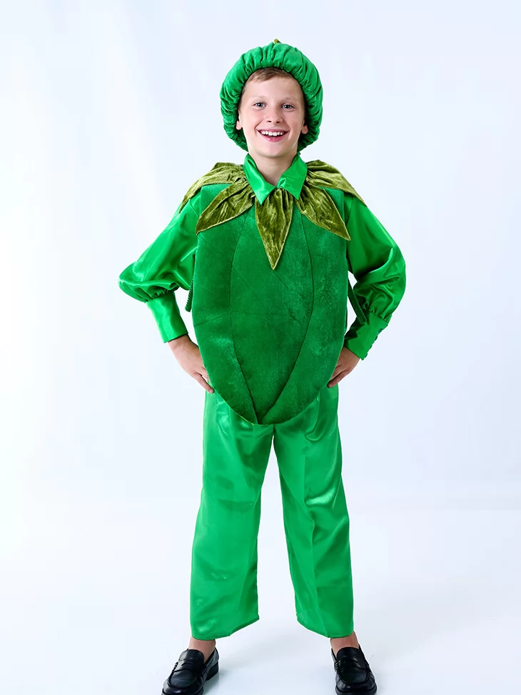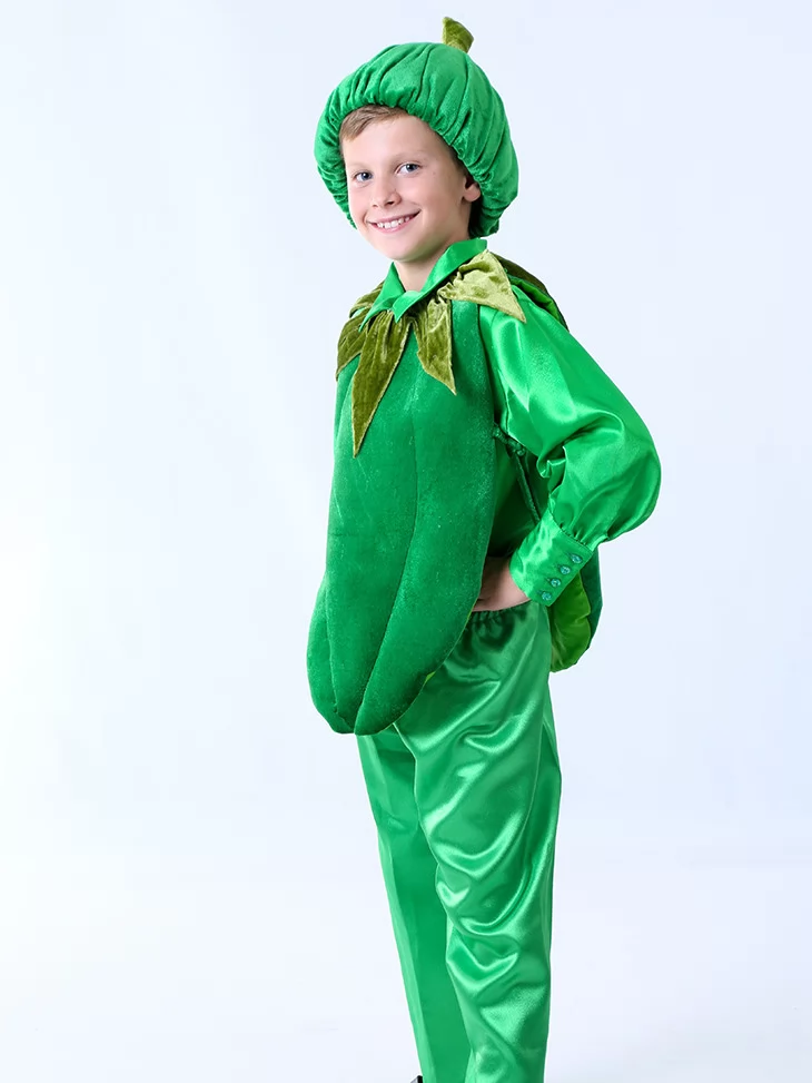 Цей веселий та свіжий образ одразу викликає усмішку й створює атмосферу свята. Насичений зелений колір, об’ємна манішка у формі огірка та кумедна шапка. Чудовий вибір для оренди карнавальних костюмів на дитячі ранки, тематичні заходи та фотосесії.