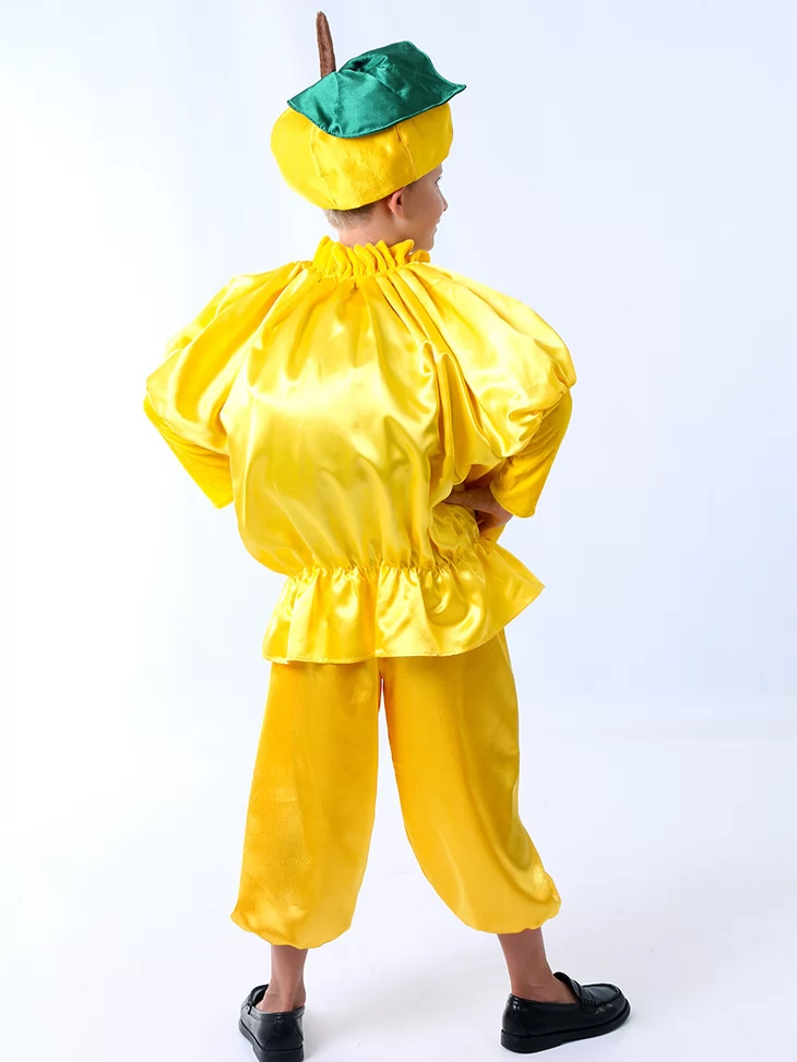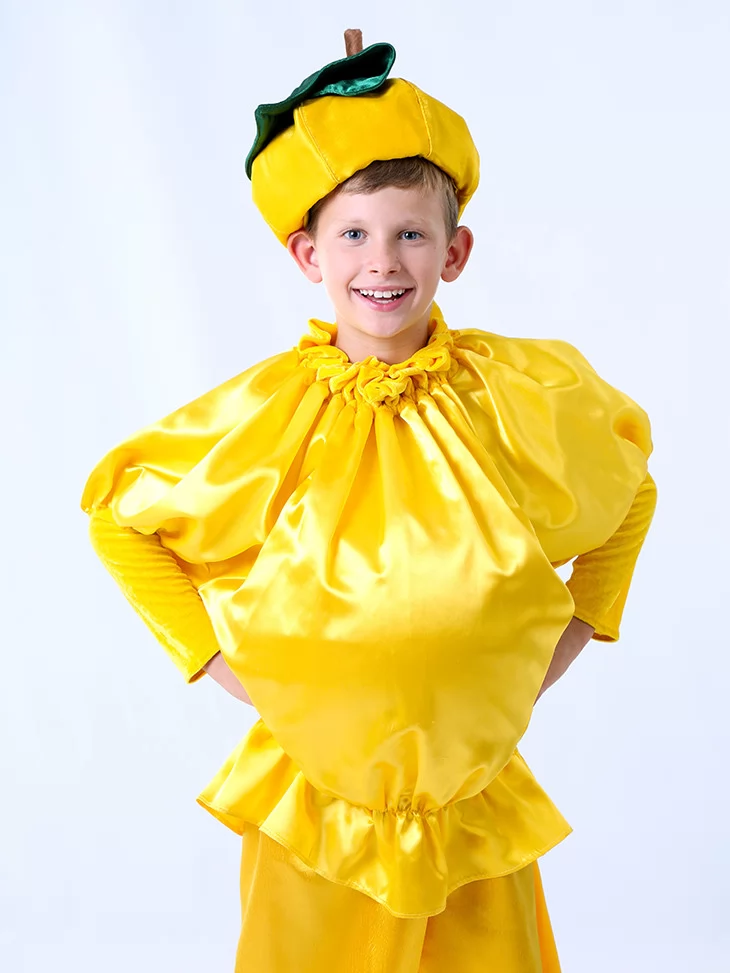Цей веселий та сонячний образ одразу дарує настрій свята й осінньої казки. Насичений жовтий колір, округлий силует і кумедна шапка у вигляді гарбуза. Чудовий вибір для оренди карнавальних костюмів на ранки, тематичні свята та фотосесії.