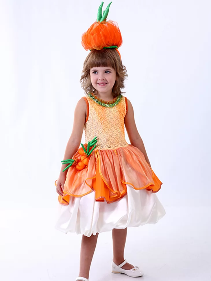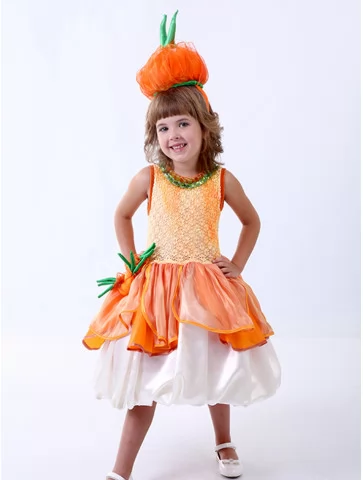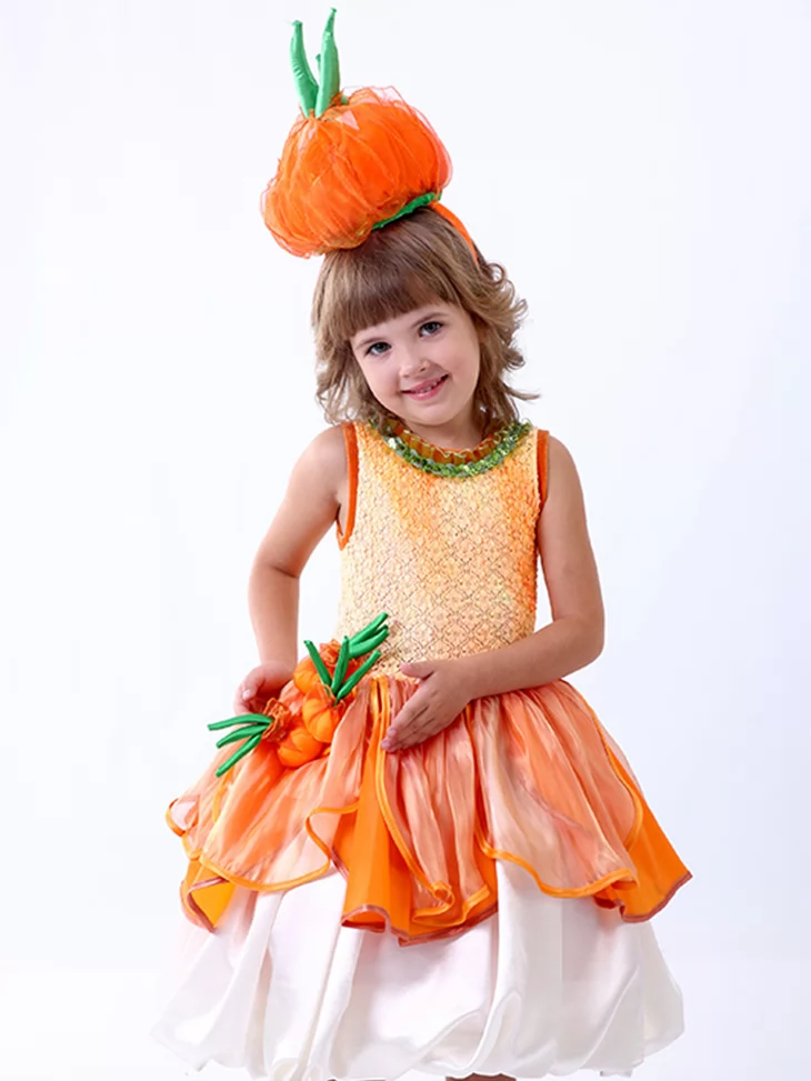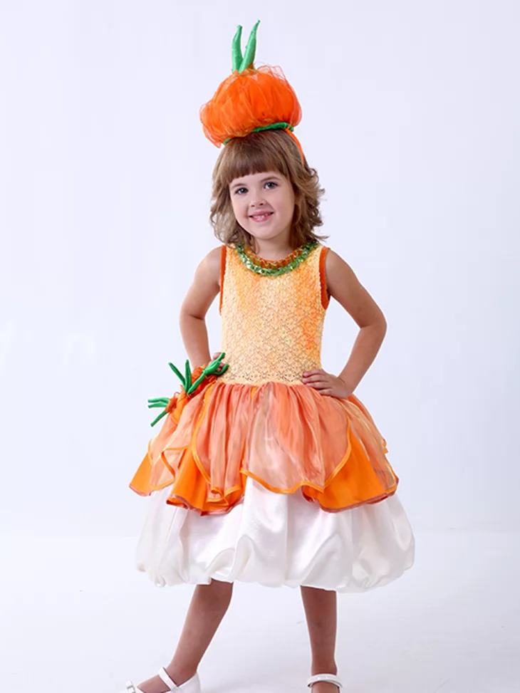 Яскравий, теплий та по-дитячому чарівний образ, що оживляє атмосферу осіннього врожаю й дарує усмішки з першого погляду. Помаранчево-золотистий верх із легким блиском красиво поєднується з пишною багатошаровою спідницею, а тематичний головний убір у формі цибулини робить образ впізнаваним і казковим. Це чудовий варіант для оренди карнавальних костюмів на свята Осені, виступи та фотосесії.